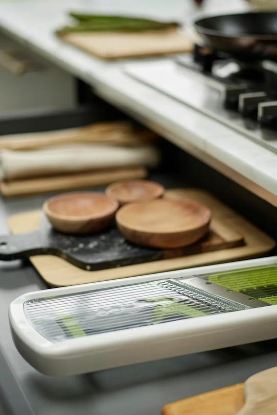 Растительная мандолина из коллекции Джозефа Джозефа. - Простой и элегантный дизайн. - Материал не содержит бисфенол А и безопасен для пищевых продуктов. - Мандолина для безопасной и ровной нарезки различных овощей и фруктов. - Регулируемая толщина нарезки: 3 для ломтиков и 2 для соломки. - Ручка с защитой для пальцев обеспечивает 3 варианта захвата: для небольших ингредиентов, для круглых ломтиков и для более длинных ломтиков. - Нескользящие ножки и складная ручка для безопасной и стабильной работы. - Изделие может контактировать с пищевыми продуктами. - Стирать следует вручную. - Размеры: 14,2 x 6,5 x 38,4 см.