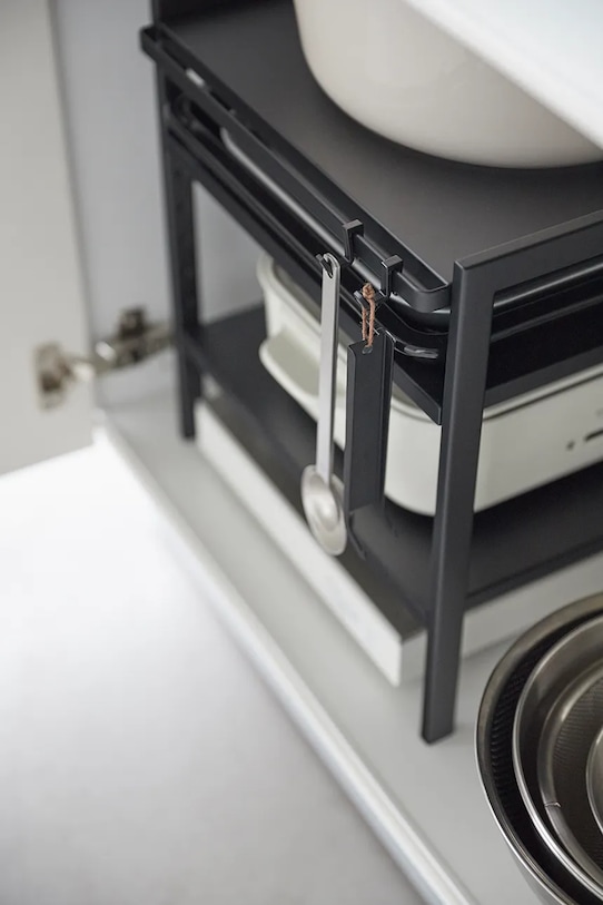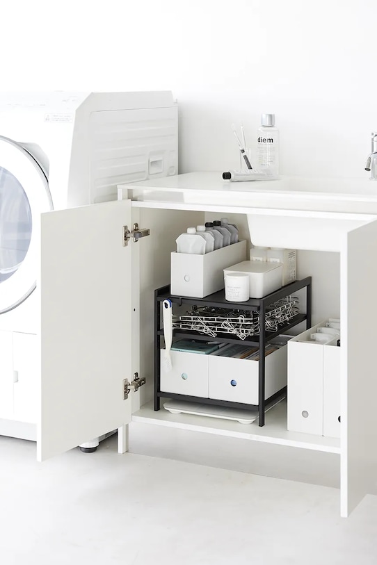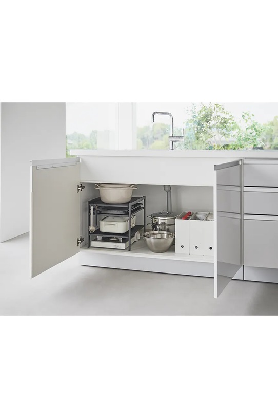Органайзер под раковиной из коллекции Yamazaki. - Простой и элегантный дизайн. - Изделие для самостоятельной сборки. - Продукт упакован в плоскую упаковку. - Максимальная нагрузка до: 10 кг/полка, 250 г/крючок. - Предлагает гибкие возможности хранения на трех уровнях с двумя регулируемыми полками, предназначенными для удовлетворения конкретных организационных потребностей. - Размеры: 33 x 41,5 x 34,5 см.