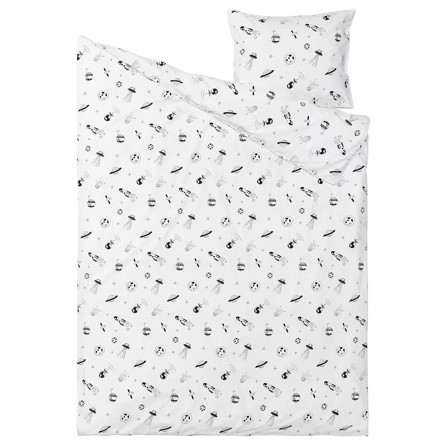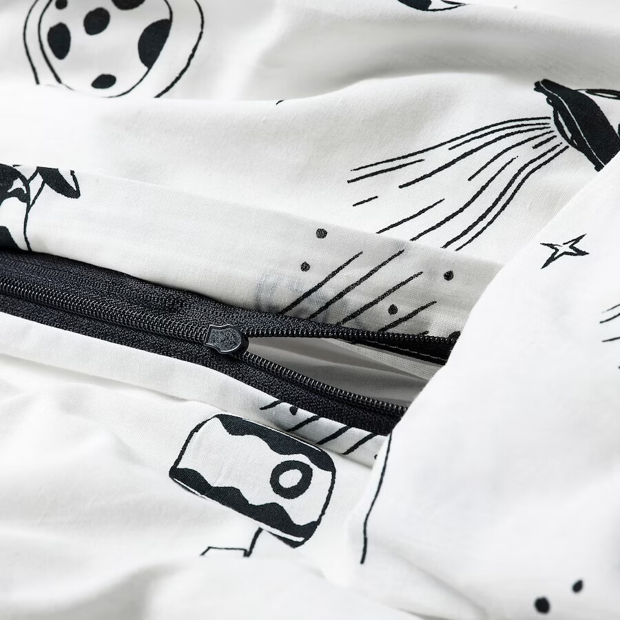 Комплект детского постельного белья с космическим принтом. Смесь хлопка и вискозы впитывает влагу и отводит её от кожи, благодаря чему температура тела остается приятно ровной. Ребёнок хорошо спит всю ночь. Молния удерживает одеяло на месте.