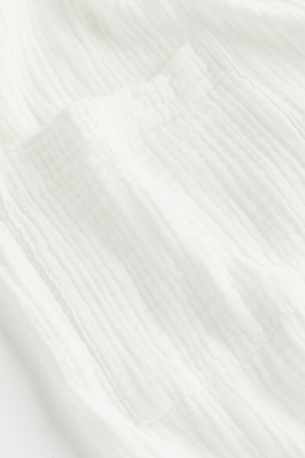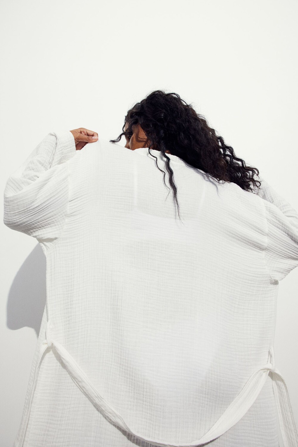 Халат из мягкого хлопкового муслина с шалевым воротником. На талии съемный пояс, накладные карманы спереди.