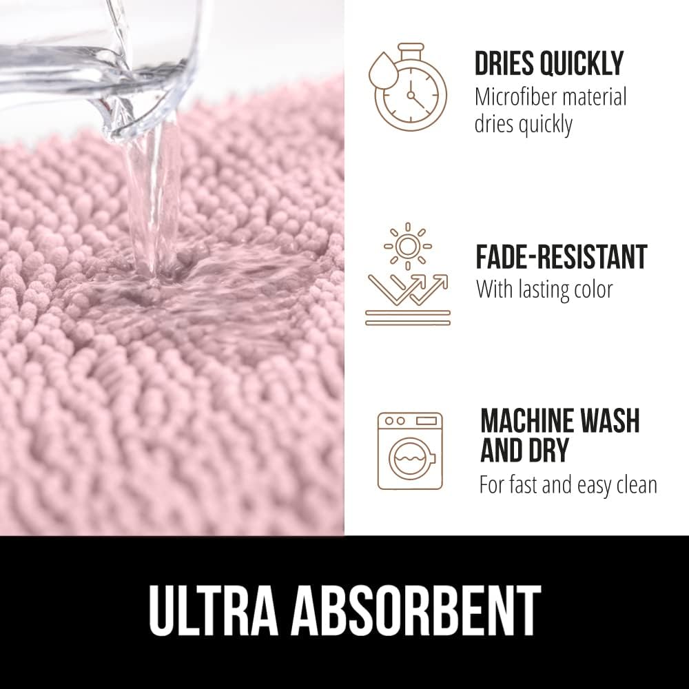 Коврик для ванной Gorilla Grip имеет впитывающий верхний слой из шенилла, который быстро удаляет влагу с ног. Его плотная резиновая подложка надёжно фиксирует коврик на полу, предотвращая скольжение. Благодаря быстросохнущим материалам, он остаётся гигиеничным и препятствует образованию плесени. Продукт идеально сочетает безопасность, удобство и практичность для ежедневного использования.