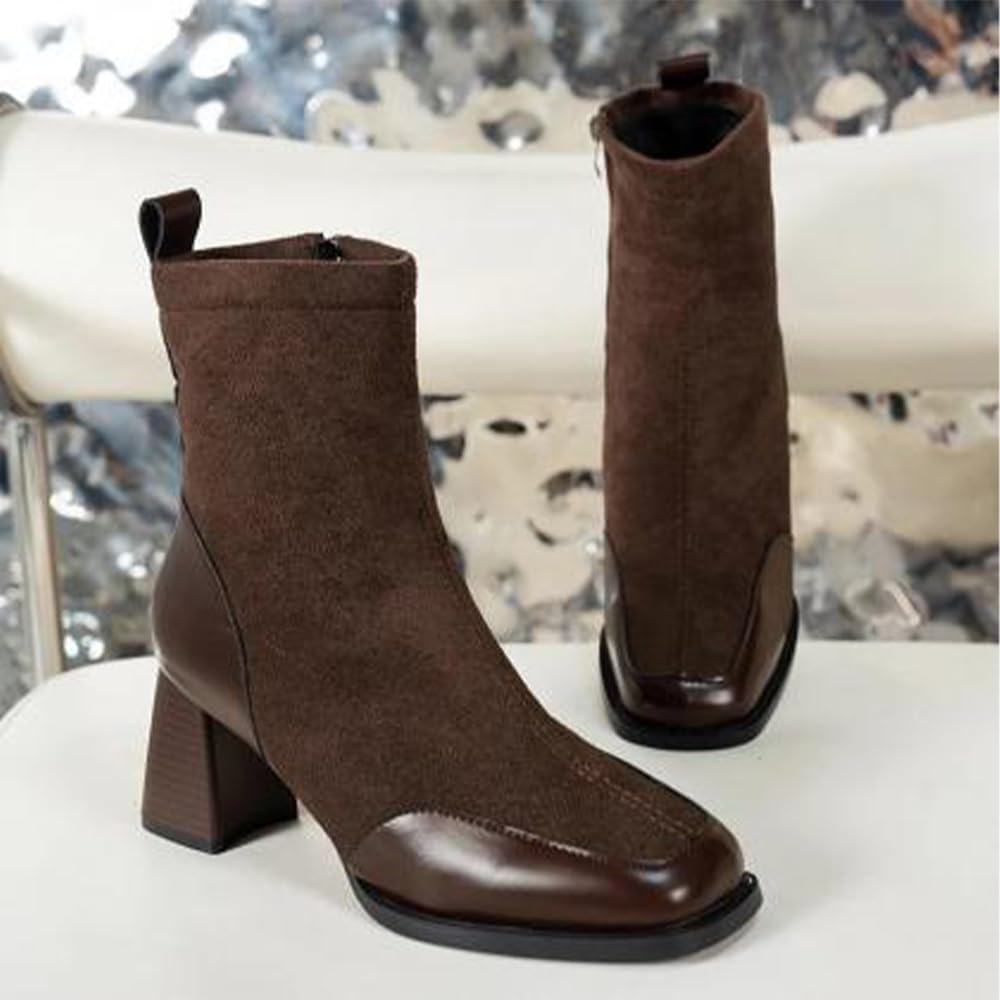 Женские ботильоны с квадратным носком на массивном каблуке - простая боковая молния, комбинированные с платьем, модные носочные удобные ботинки средней длины Generic, Brown