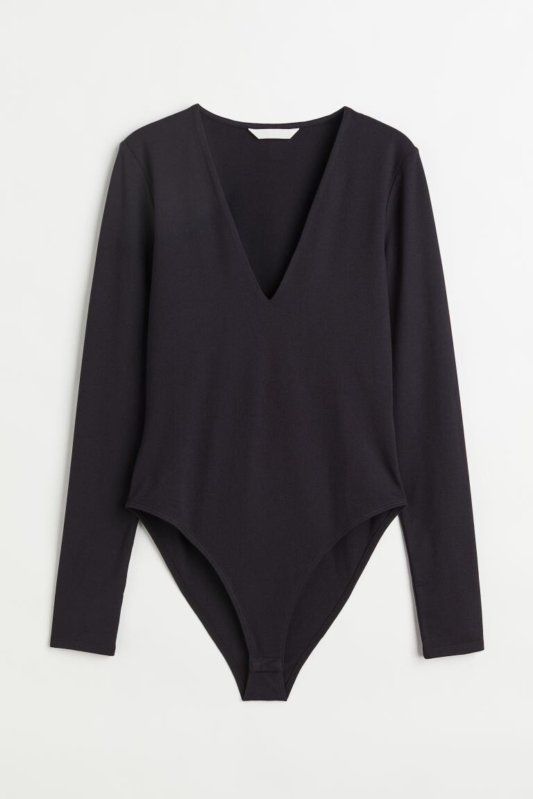 Боди из джерси с V-образным вырезом, длинными рукавами, потайными кнопками в области промежности и высоким вырезом сзади.