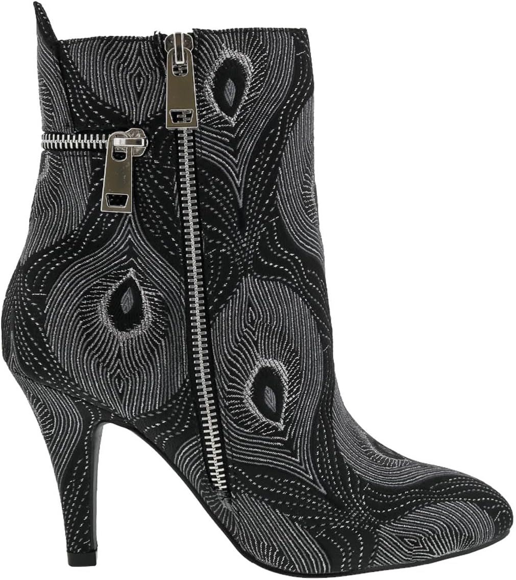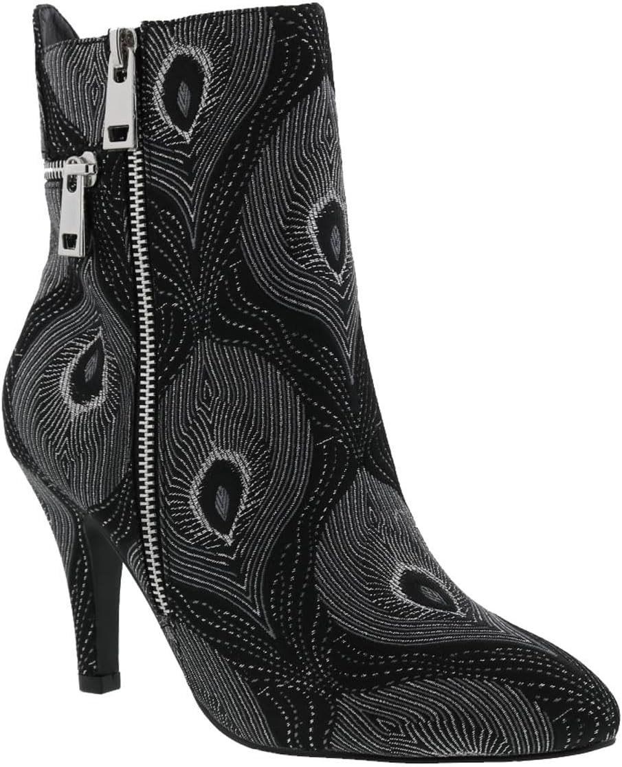 Дерзкие ботильоны добавляют остроты вашему гардеробу с декоративными горизонтальными и вертикальными золотистыми молниями сзади и с внешней стороны. Эти нарядные ботильоны Claudette от Bellini имеют принт с узором павлина и застегиваются на молнию для удобного надевания и снятия.