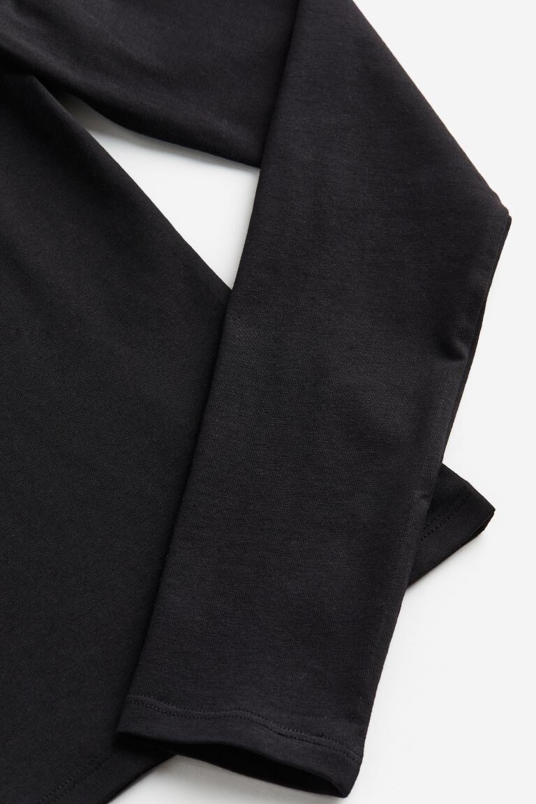 Укороченный приталенный топ из мягкого трикотажа с круглым вырезом, длинными рукавами и прямым подолом.