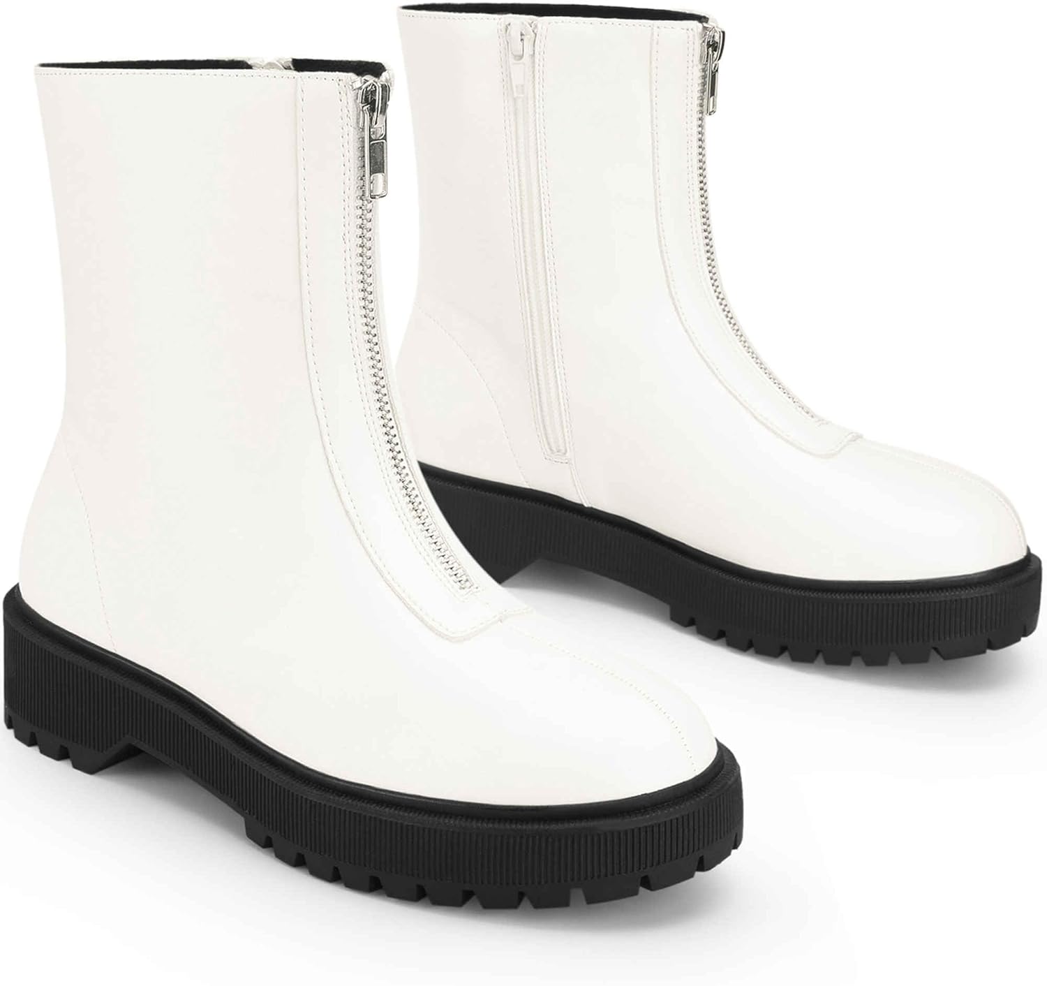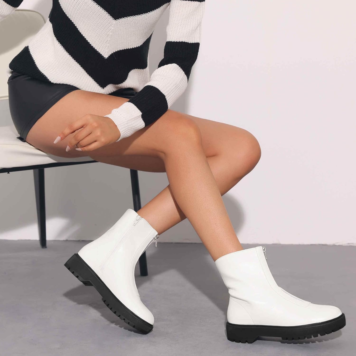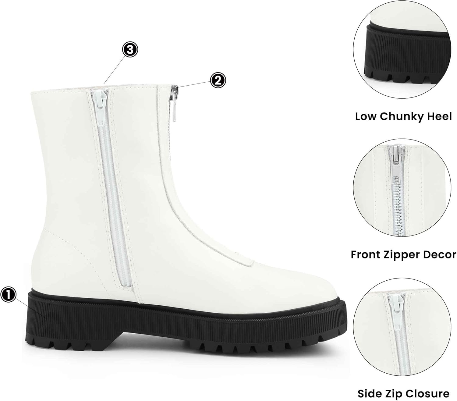 [Сочетание]: в сочетании с джинсами с высокой талией или вязанными платьями устойчивый каблук обеспечивает комфорт при ходьбе, а молния добавляет яркую деталь, что делает их удобными для походов по магазинам или встреч за кофе в выходные