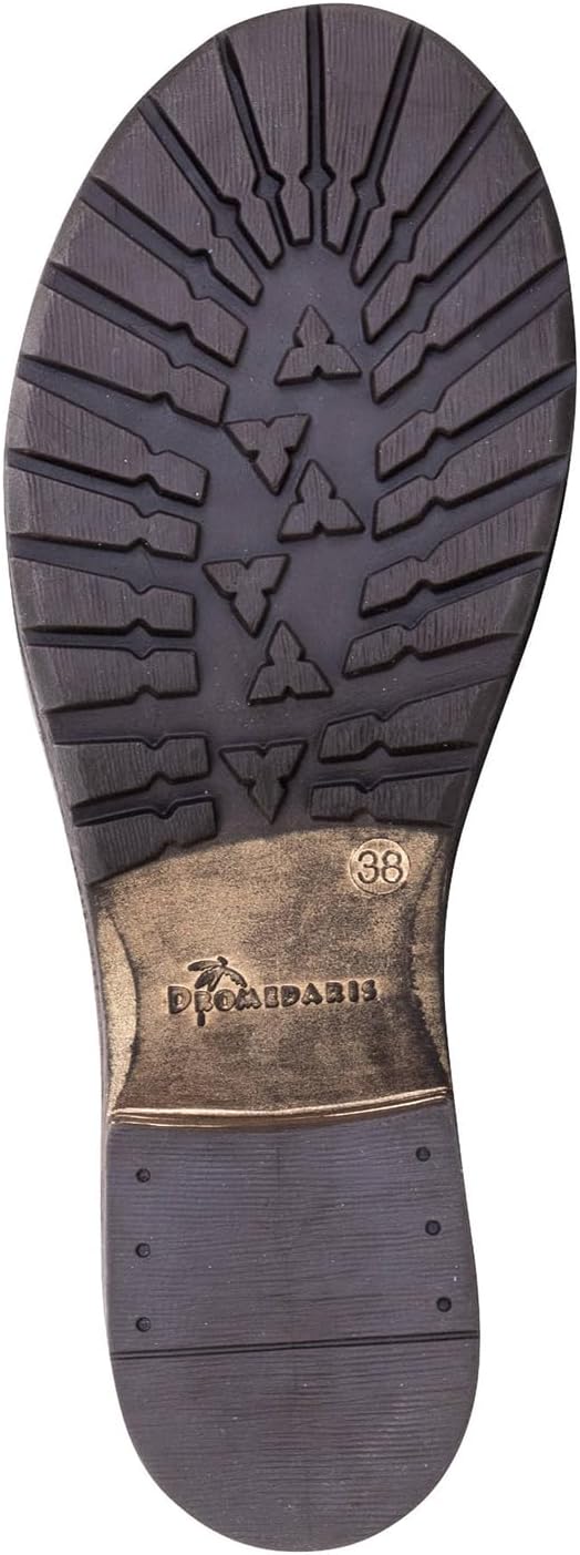 Ботильоны Dromedaris Kassia на щиколотке с внутренней молнией для легкого надевания выполнен из мягкой вощеной кожи, скрученной для создания складчатого эффекта и идеально отполированной. Металлическая отделка и красивая строчка делают эту обувь действительно особенной. Меховая подкладка обеспечивает тепло, дышимость и дополнительный комфорт. Съемная стелька «4D Technology» для боковой стабильности и поддержки свода стопы с метатарзальной вставкой для амортизации ударов и мягкой подушки. Эксклюзивная резиновая подошва Dromedaris TR с новым кожаным рантом с крупной строчкой, эффектом многослойного каблука, некоторые модели с легким металлизированным матовым финишем.