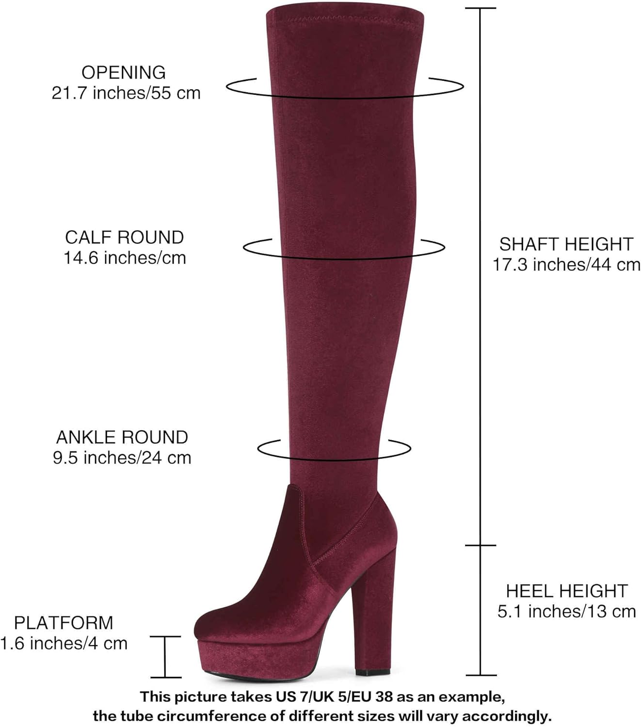 [Высота каблука]: 13 см (прибл. 5,1 дюйма), высота платформы: 4 см (прибл. 1,6 дюйма), высота голенища: 55 см (прибл. 21,7 дюйма), обхват манжеты: 44 см (прибл. 17,3 дюйма), обхват голени: 37 см (прибл. 14,6 дюйма), обхват щиколотки: 24 см (прибл. 9,5 дюйма)