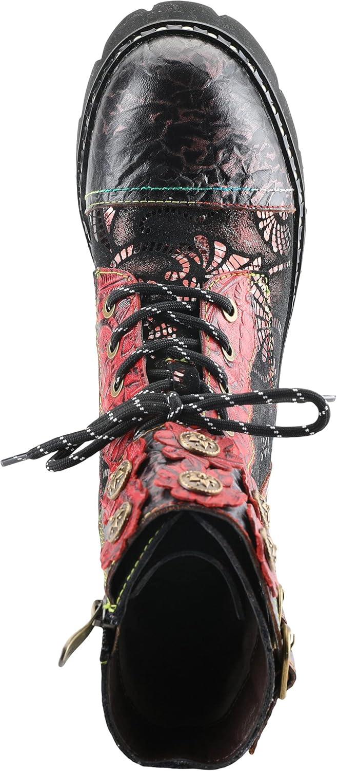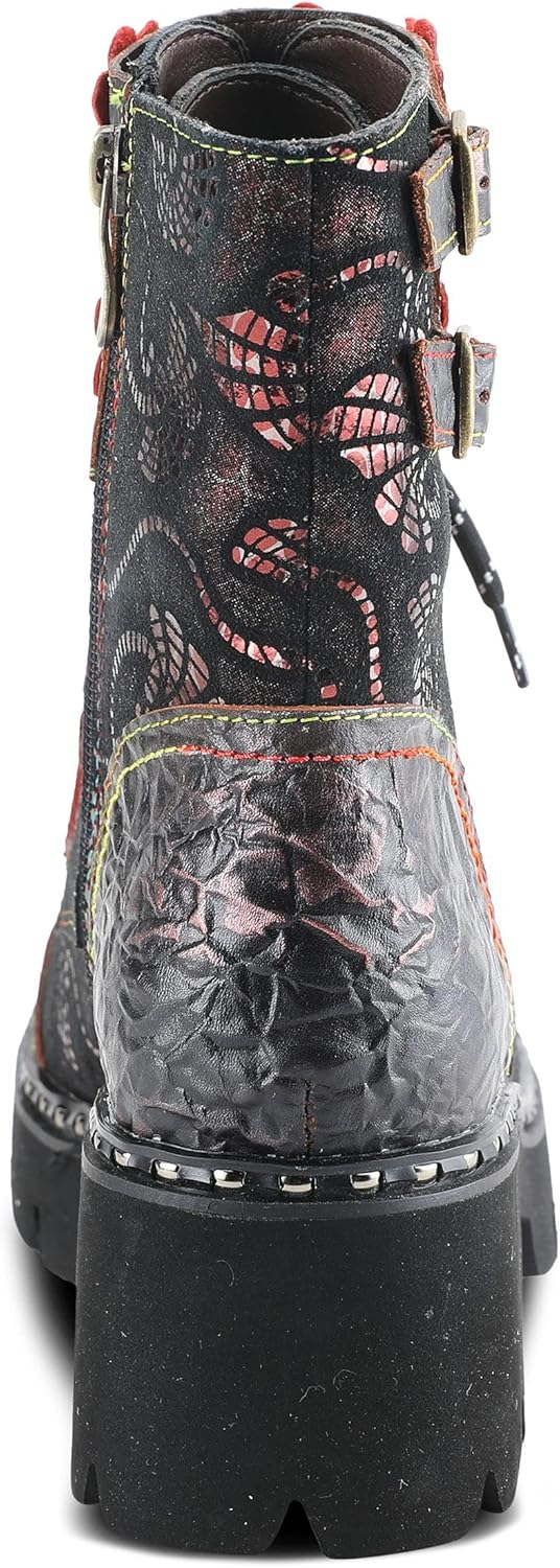 Стиль L'ARTISTE: LIMITLESS. Воплотите рок-н-ролл с этими потрясающими кожаными ботинками с цветочными вырезами, заклепками, верхним ремешком и нашей фирменной радужной строчкой на современной подошве с протектором. Верх: кожа. Подкладка: искусственный мех. Стелька: искусственный мех. Подошва: EVA. Застежка: пряжка, шнуровка, молния. Высота каблука: 5,7 см. Высота платформы: 2,5 см. Высота голенища: 15,9 см. Окружность голенища: 24,1 см. Особенности: регулируемые, комфортные, ручная роспись, стелька с подкладкой, премиум. Отказ от ответственности: изделия L’Artiste изготавливаются из натуральной выделанной кожи с использованием традиционных техник ручной росписи. Этот уникальный процесс отделки создает естественный эффект с вариациями цвета, обеспечивая подлинный внешний вид и красоту.