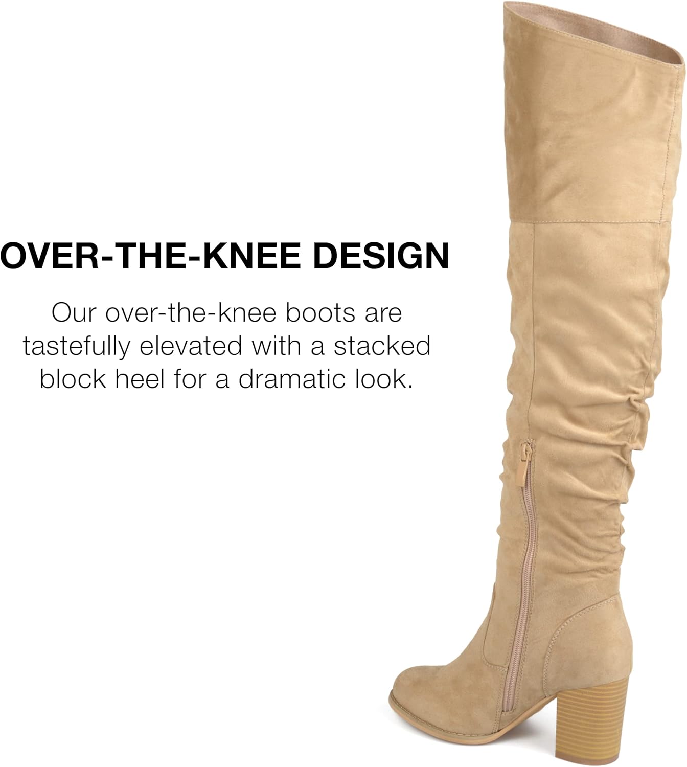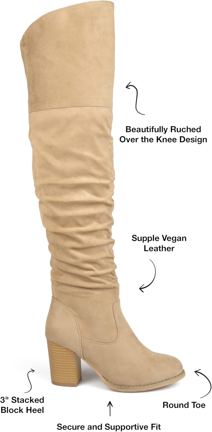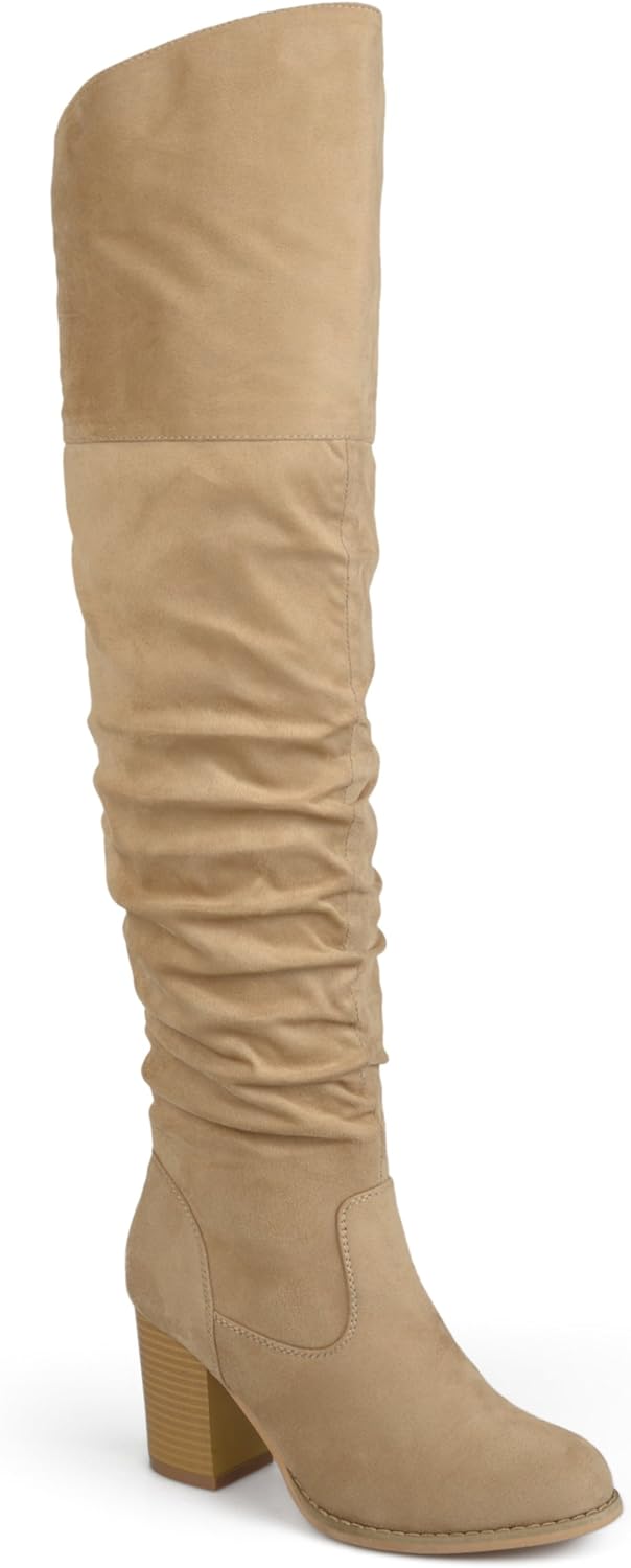 Ботфорты с драпировкой выше колена от Journee выполнены из мягкого искусственного замша, поднимаются выше колен с приподнятым верхом, создавая стильные детали. Закругленный носок и массивные высокие каблуки завершают дизайн. В Journee наши модели ботинок сделают ваш наряд еще более эффектным. Они придадут вашему образу завершающий штрих, который будет выглядеть как с обложки журнала.