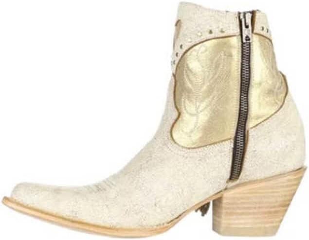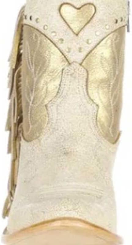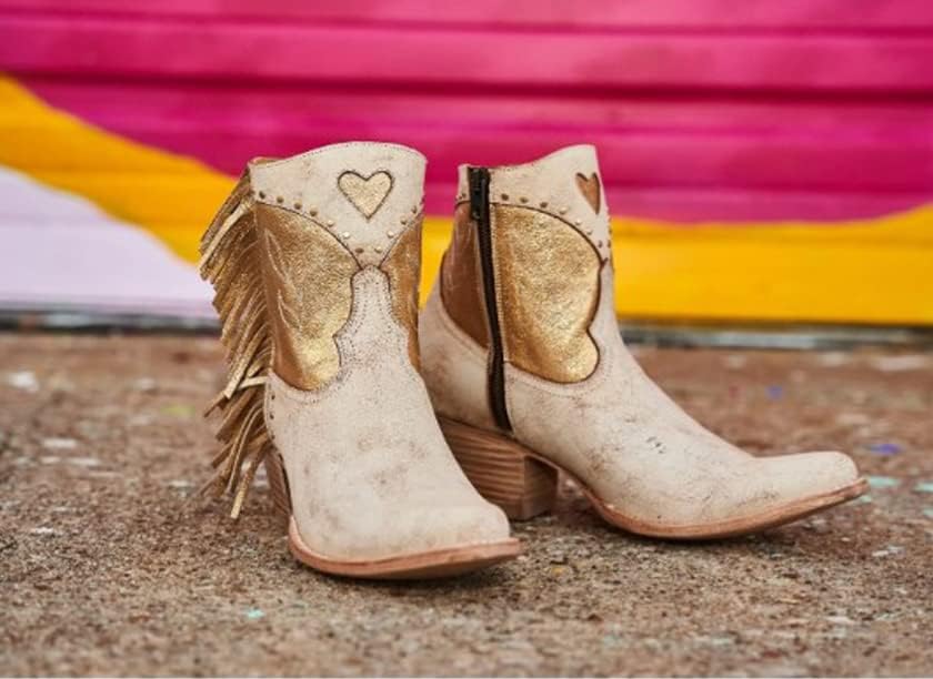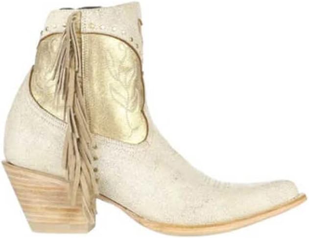 Эти западные ботильоны завораживают металлической кожей и бахромой, создавая текстурный акцент. Потертая кожа цвета кости и мягкий заостренный носок придают им современную привлекательность, а элегантный устойчивый кожаный каблук завершает образ.