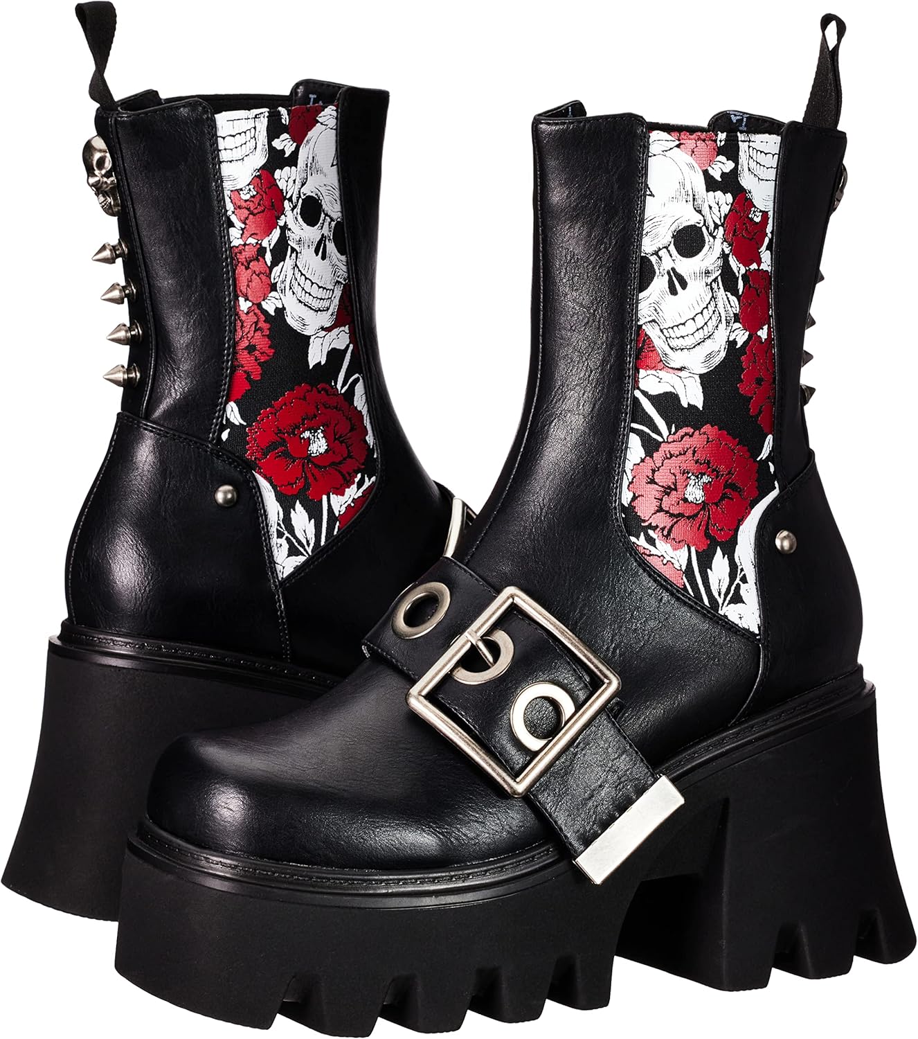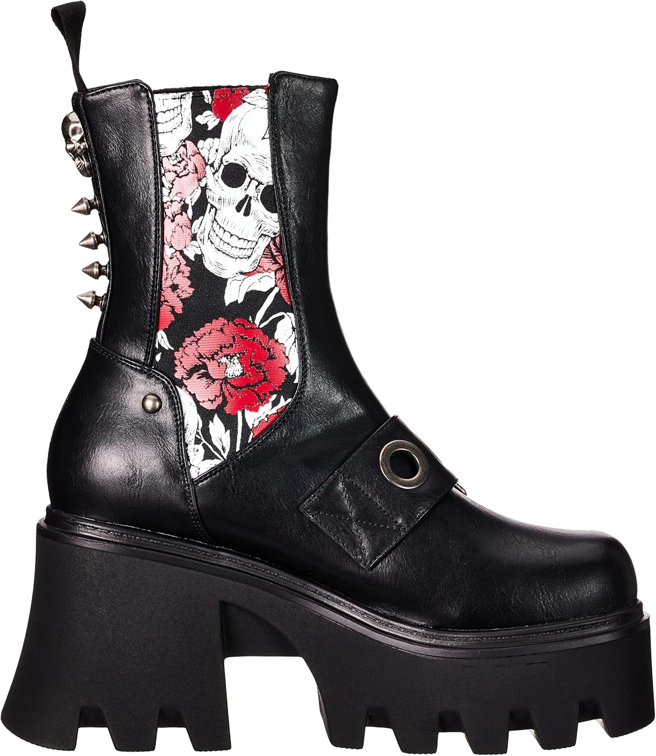 На боках ботинок, в эластичном вставке, расположены красная роза и череп.