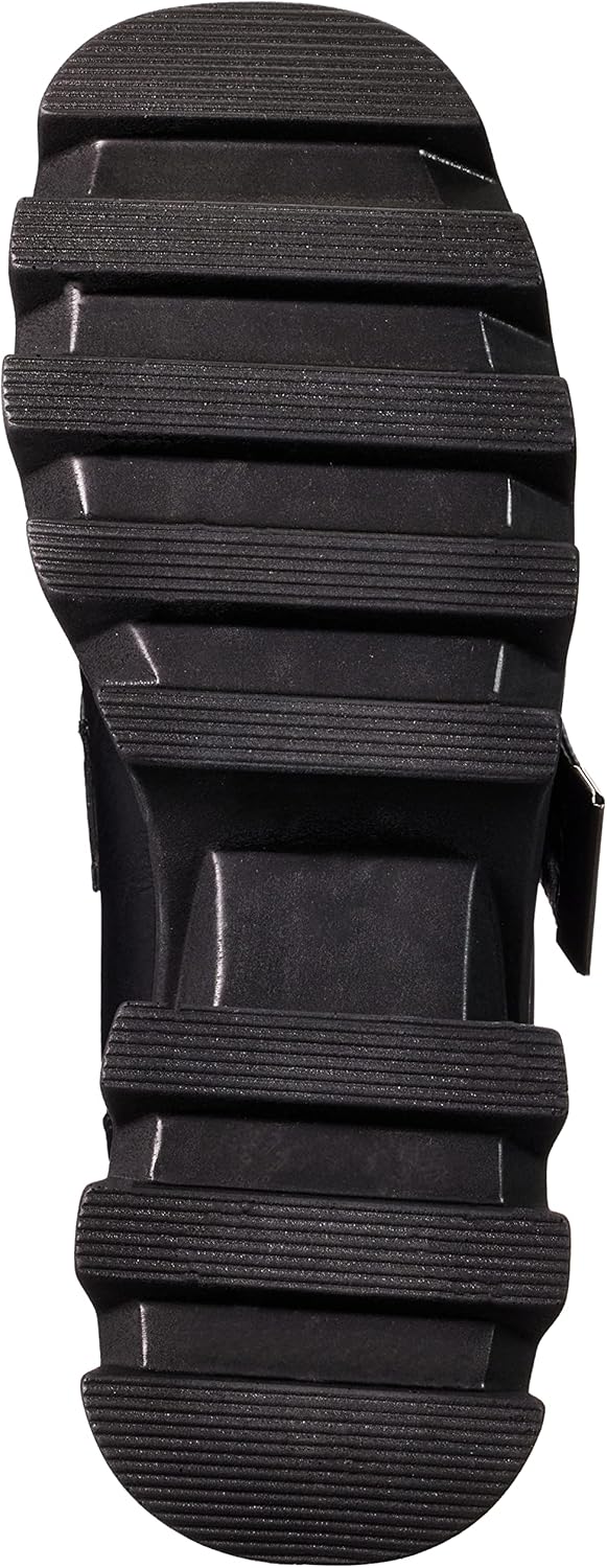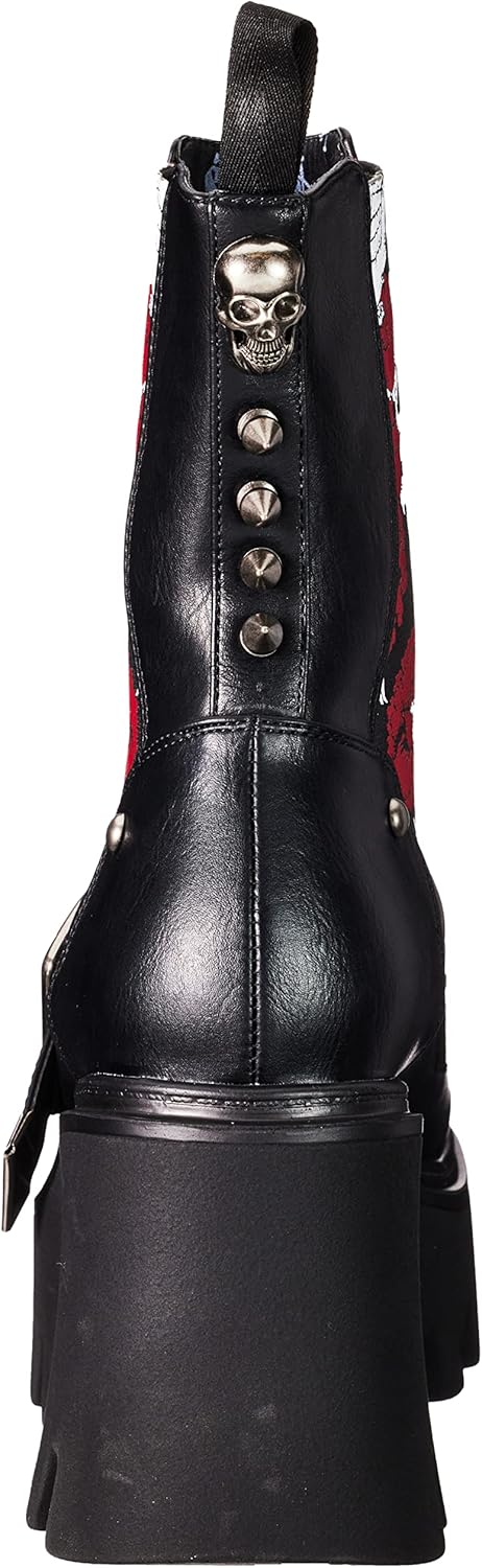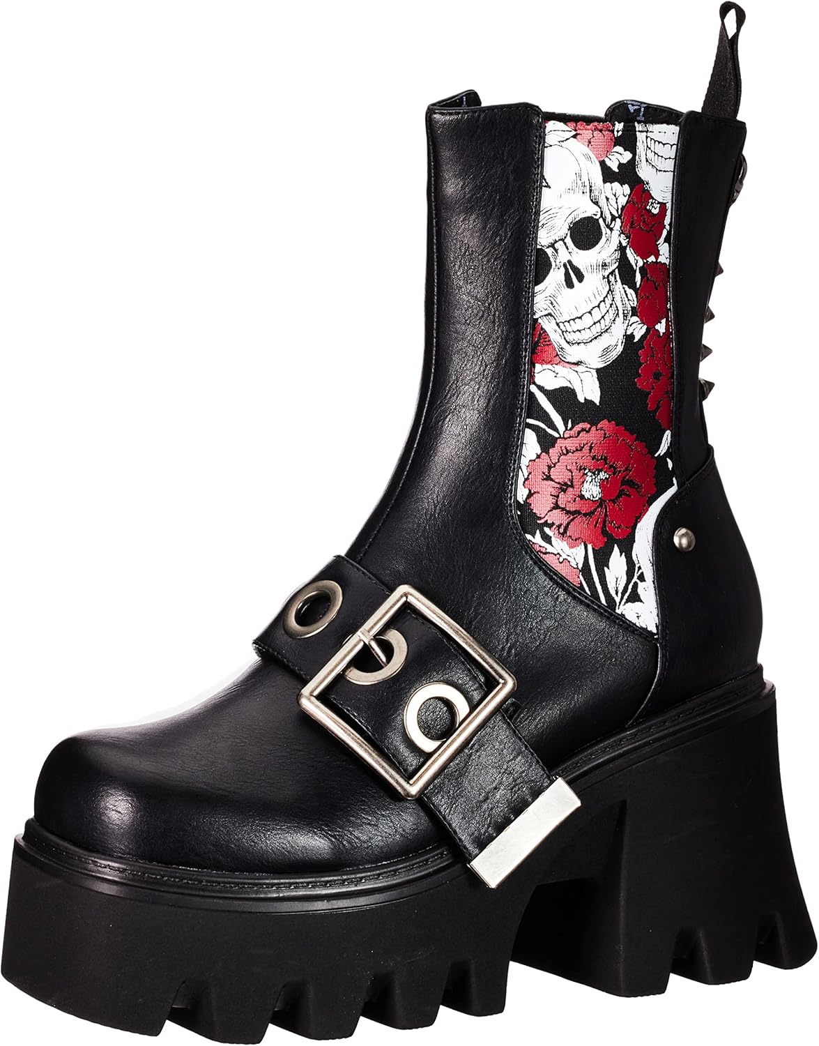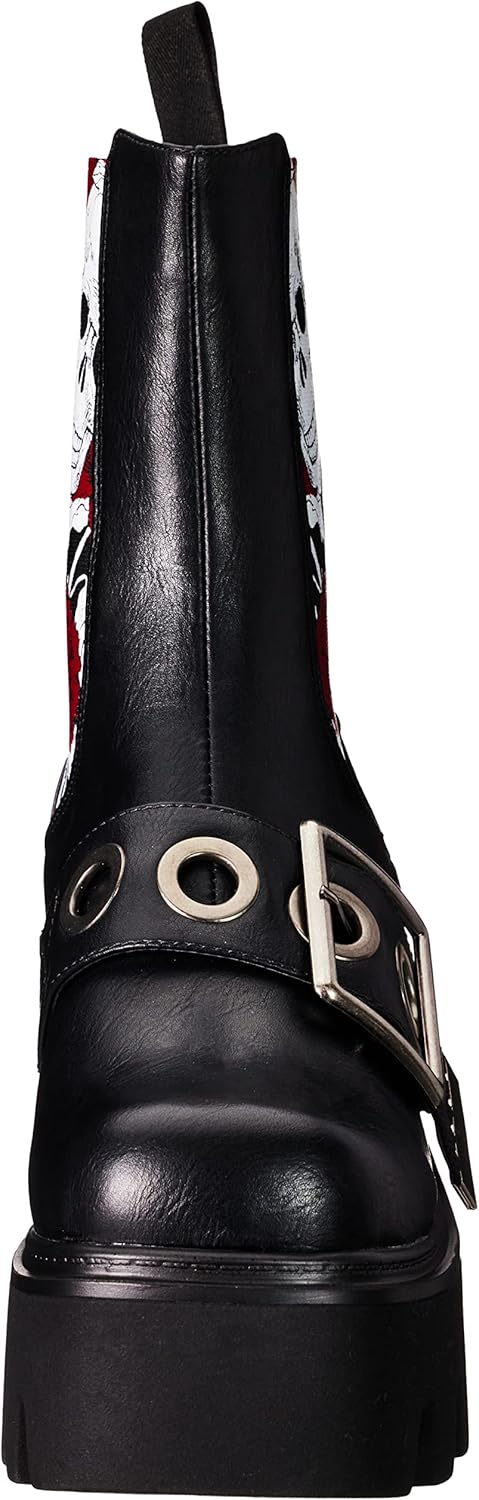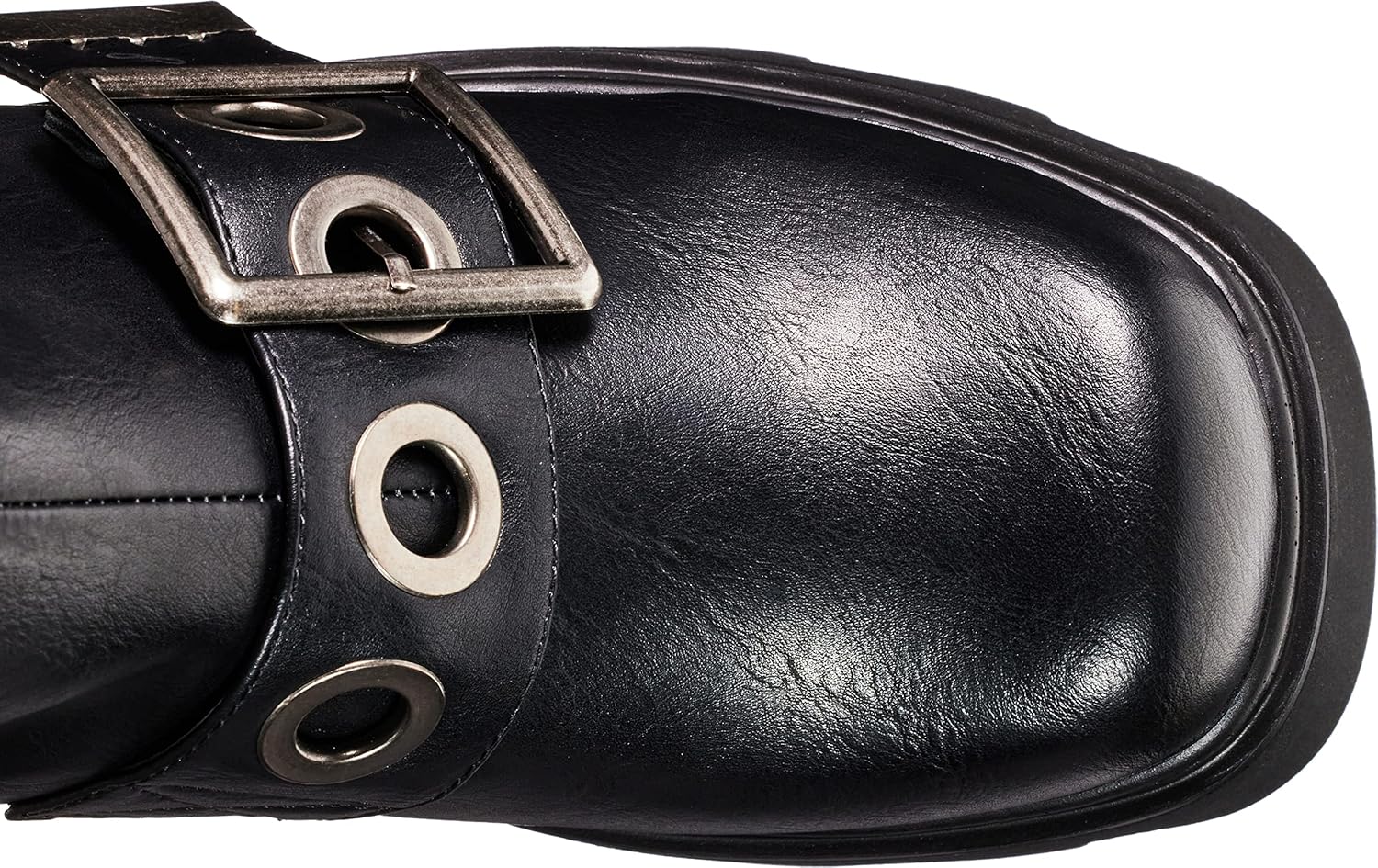 Черный ремешок на верхней части ботинок с большой серебряной квадратной пряжкой и серебристыми люверсами. Также имеются серебряные шипованные заклепки и черная петля сзади ботинок, а также серебряный череп.