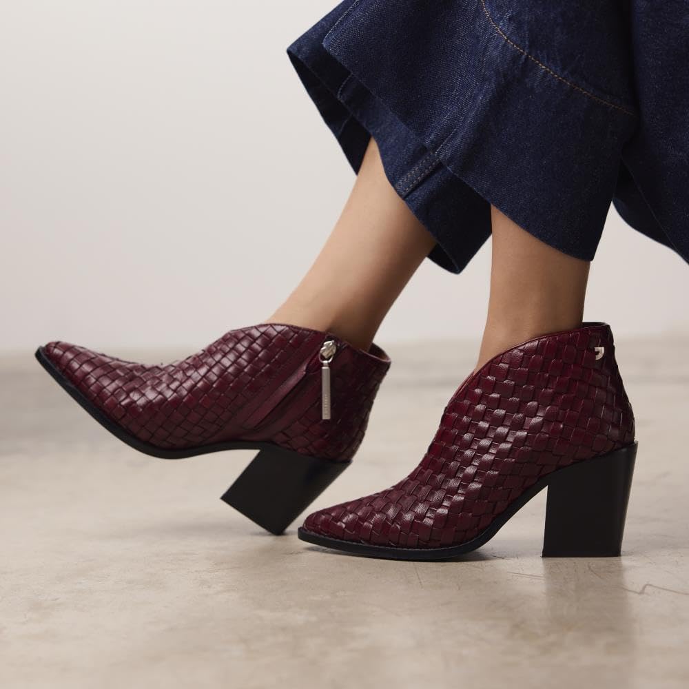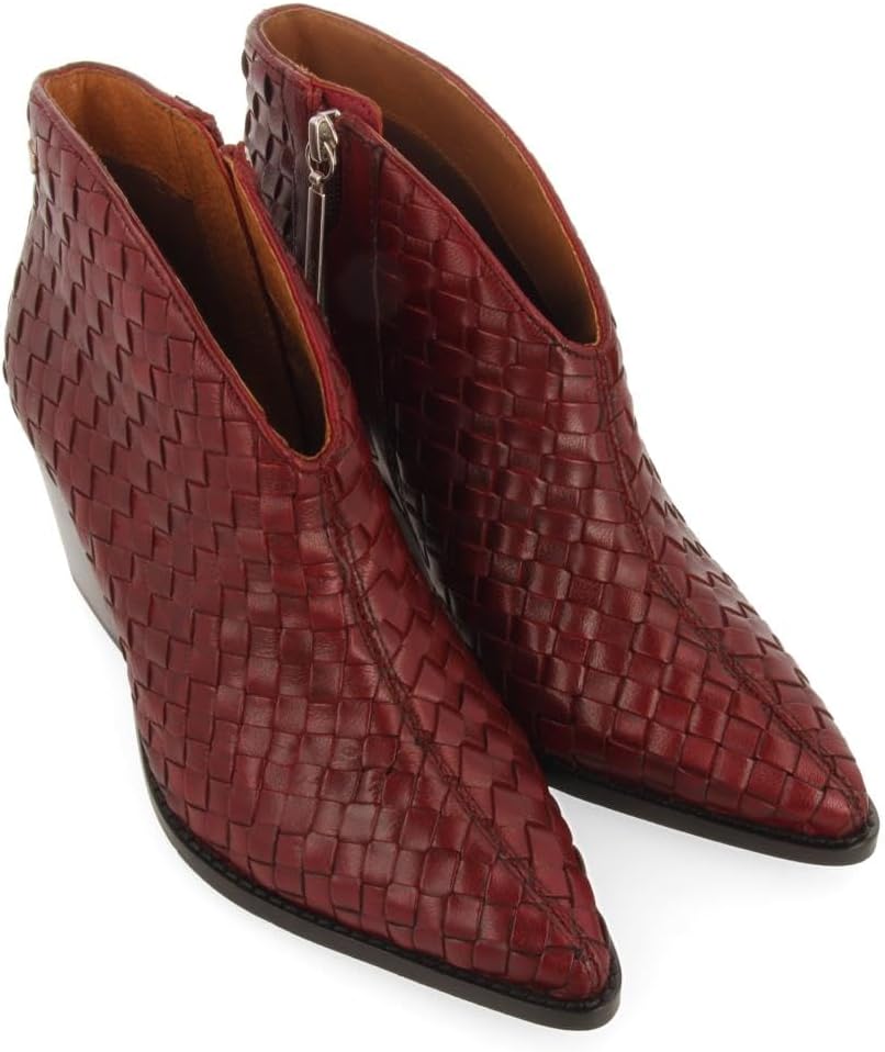 Бордовые кожаные ботильоны с ручной плетеной отделкой и каблуком Они оснащены высоко мягкой стелькой, натуральными растительными волокнами и резиновой подошвой Стелька, подкладка и посадка выполнены из дубленой кожи на кожевнях, которые используют более устойчивые процессы согласно стандартам Leather Working Group (LWG) Кожа