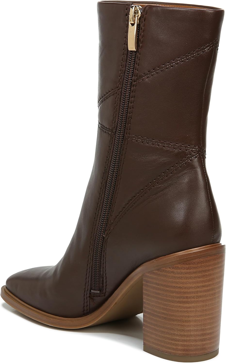 Женские ботильоны на каблуке с верхом из кожи или замши, частично выполненные из переработанных материалов Ботильоны средней высоты с боковой молнией для легкого надевания и снятия Современные ботинки с квадратным носком для женщин Современные ботинки с модными декоративными швами имеют слегка мягкую стельку для дополнительного комфорта Высота голенища 18,2 см, обхват 25 см