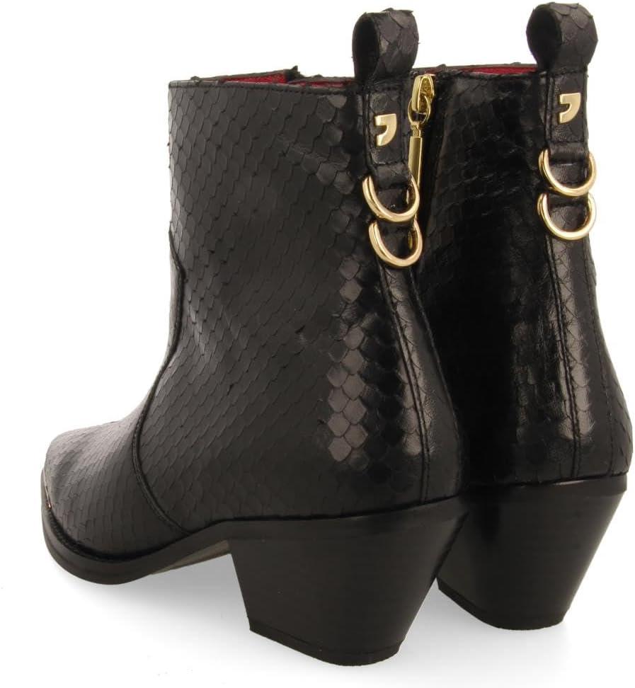 Йи-хаа! Черные ковбойские ботинки до щиколотки из фактурной кожи, с каблуком и металлической отделкой Они имеют очень мягкую стельку, резиновую подошву и подошву, сделанную из натуральных волокон Подкладка, отделка и стелька изготовлены из выделанной кожи на кожевенных предприятиях, которые используют более устойчивый процесс выделки по стандартам Leather Working Group (LWG) Пряжа для тканей, используемых в производстве подкладки, имеет сертификацию по стандарту Global Recycle Standard (GRS)