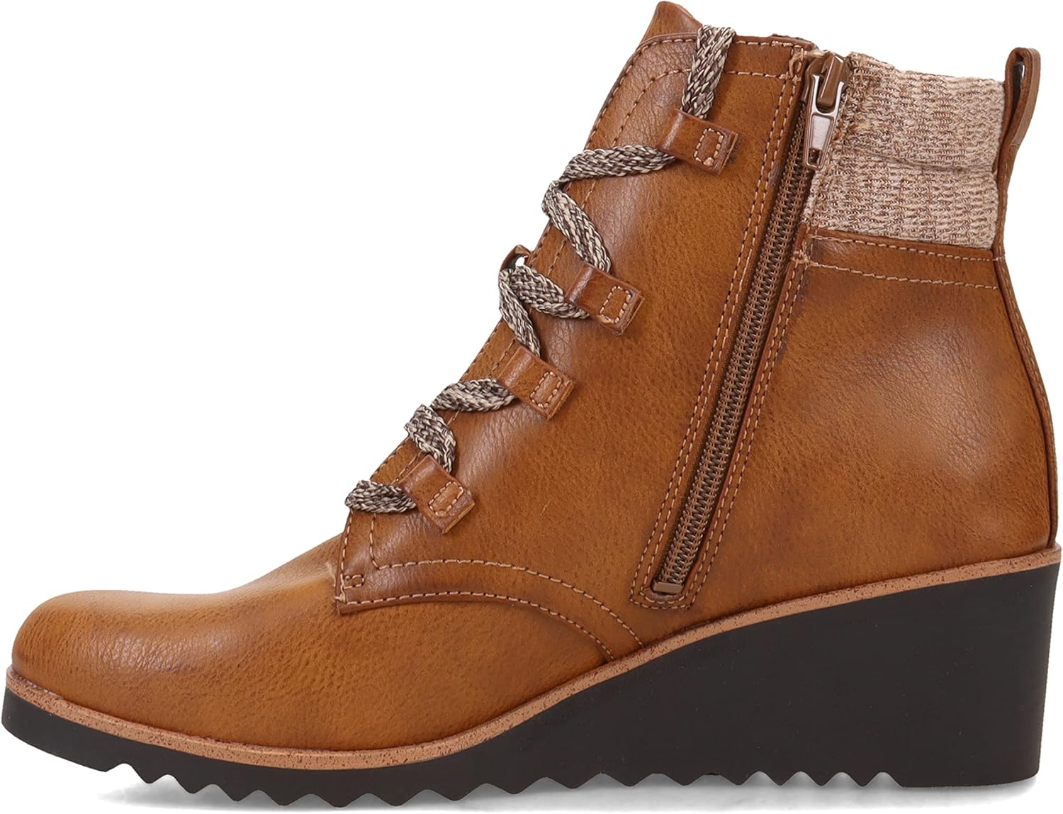 Поднимите любой образ на новый уровень стиля и комфорта с этими туристическими ботинками на танкетке с выдающимся дизайном из комбинированных материалов. Верх выполнен из искусственной кожи, микровелюра или ткани, с круглым носком, внутренней молнией, шнуровкой спереди, вязаным воротником-пуловером, задней петлей для надевания, лакированными деталями колодки и рифленой подошвой. Носочная часть и пятка изготовлены из переработанных материалов.