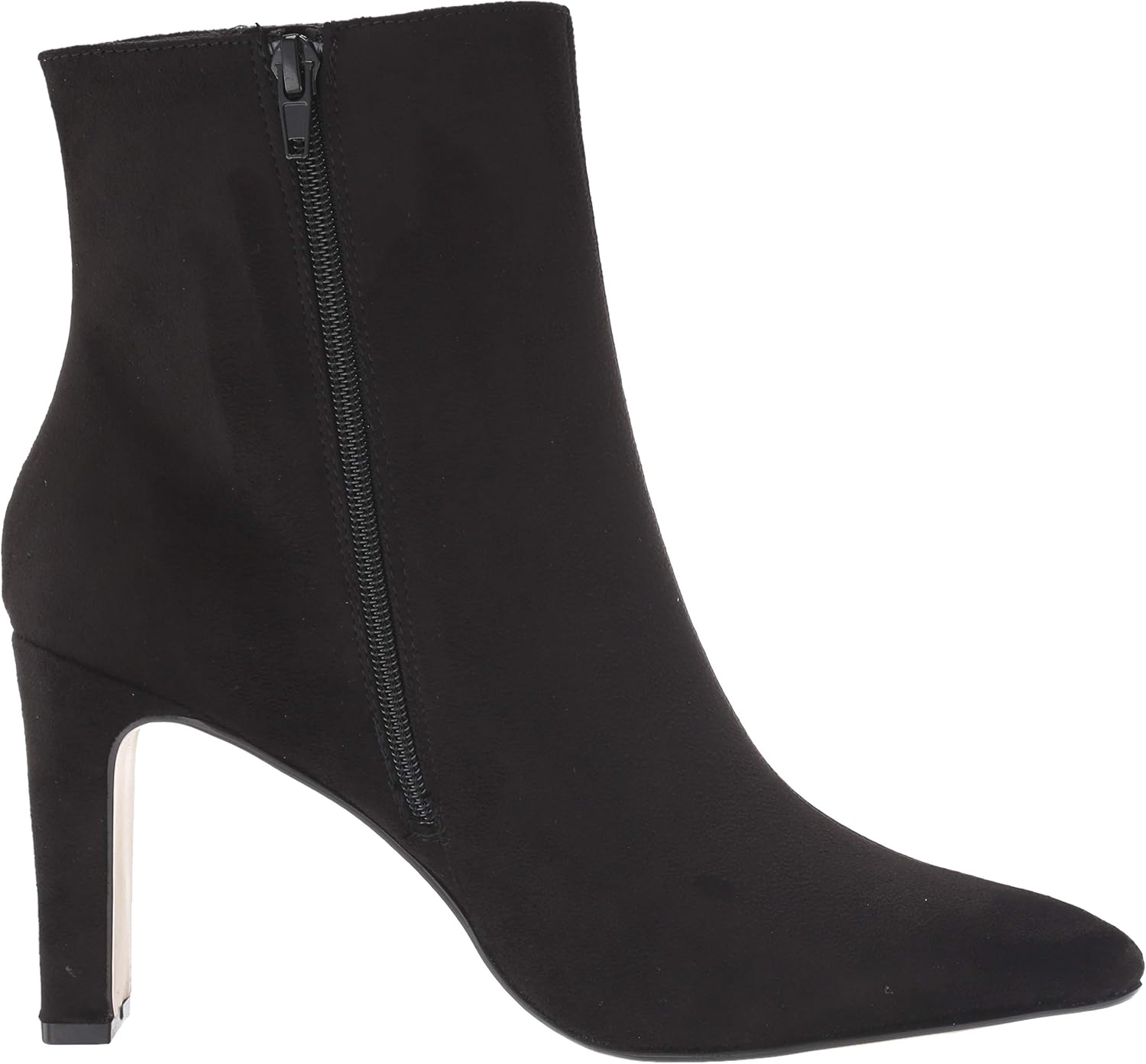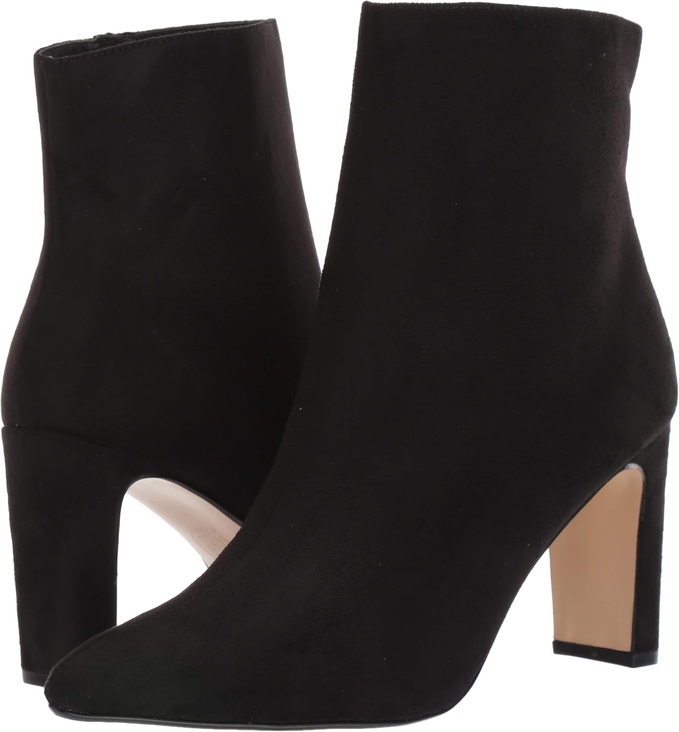 Ботильоны с заостренным носком, полу-лунным каблуком-блоком и боковой застежкой-молнией.