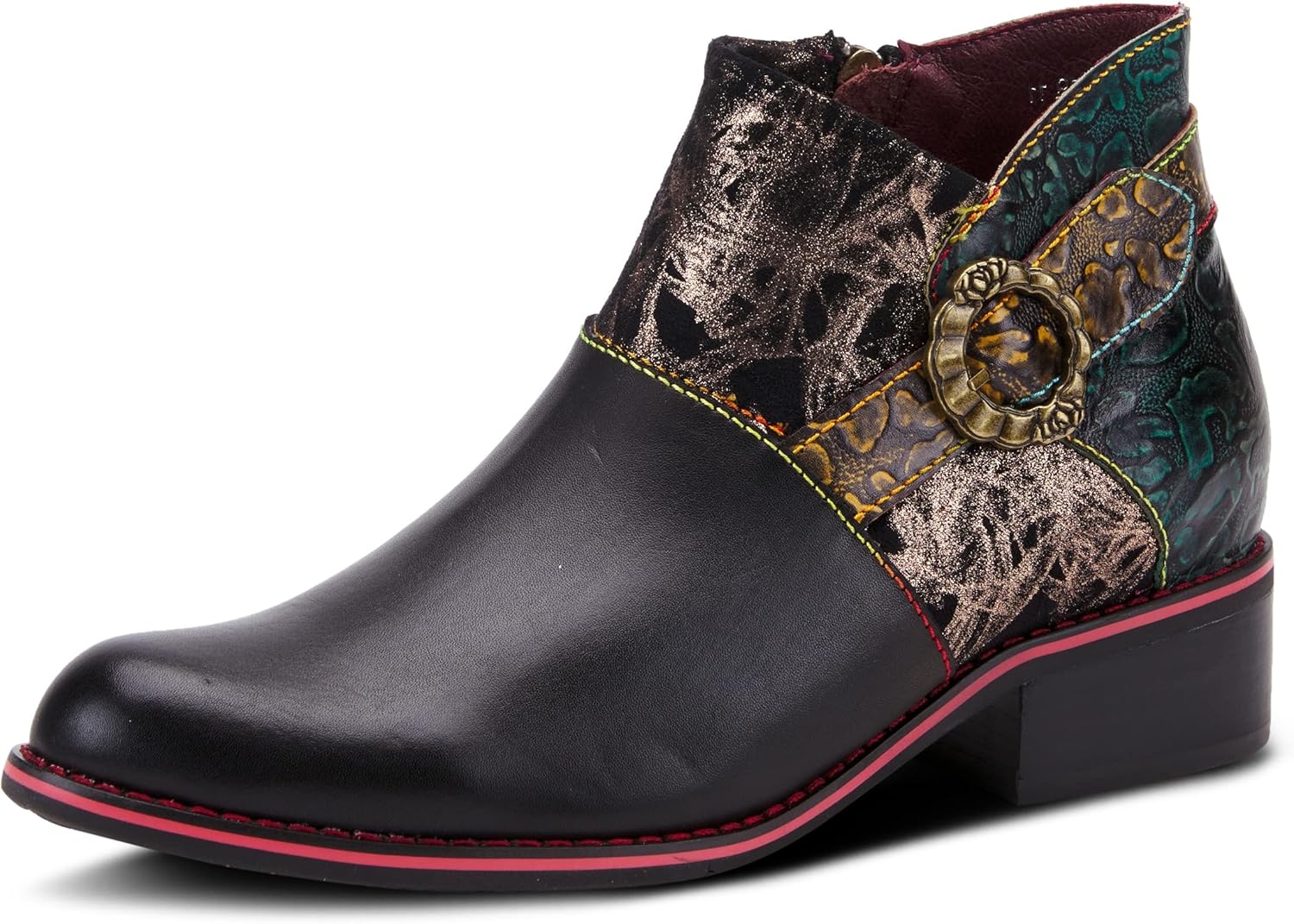 ботильоны до щиколотки, выполненные в смешанном стиле с ручной росписью на тисненой коже, гладкой коже и мягком микрозаме, с декоративным асимметричным ремешком с винтажной пряжкой на двухцветной простроченной подошве и плоском блочном каблуке