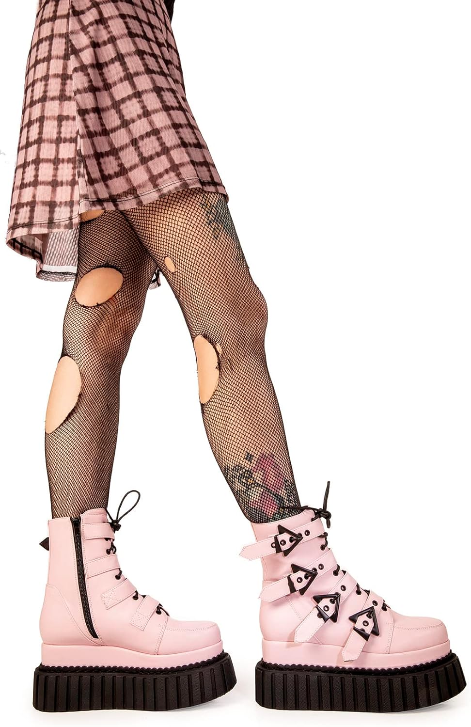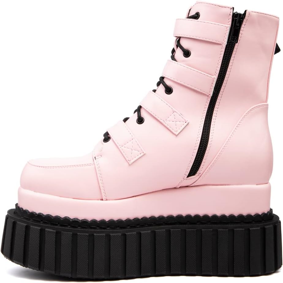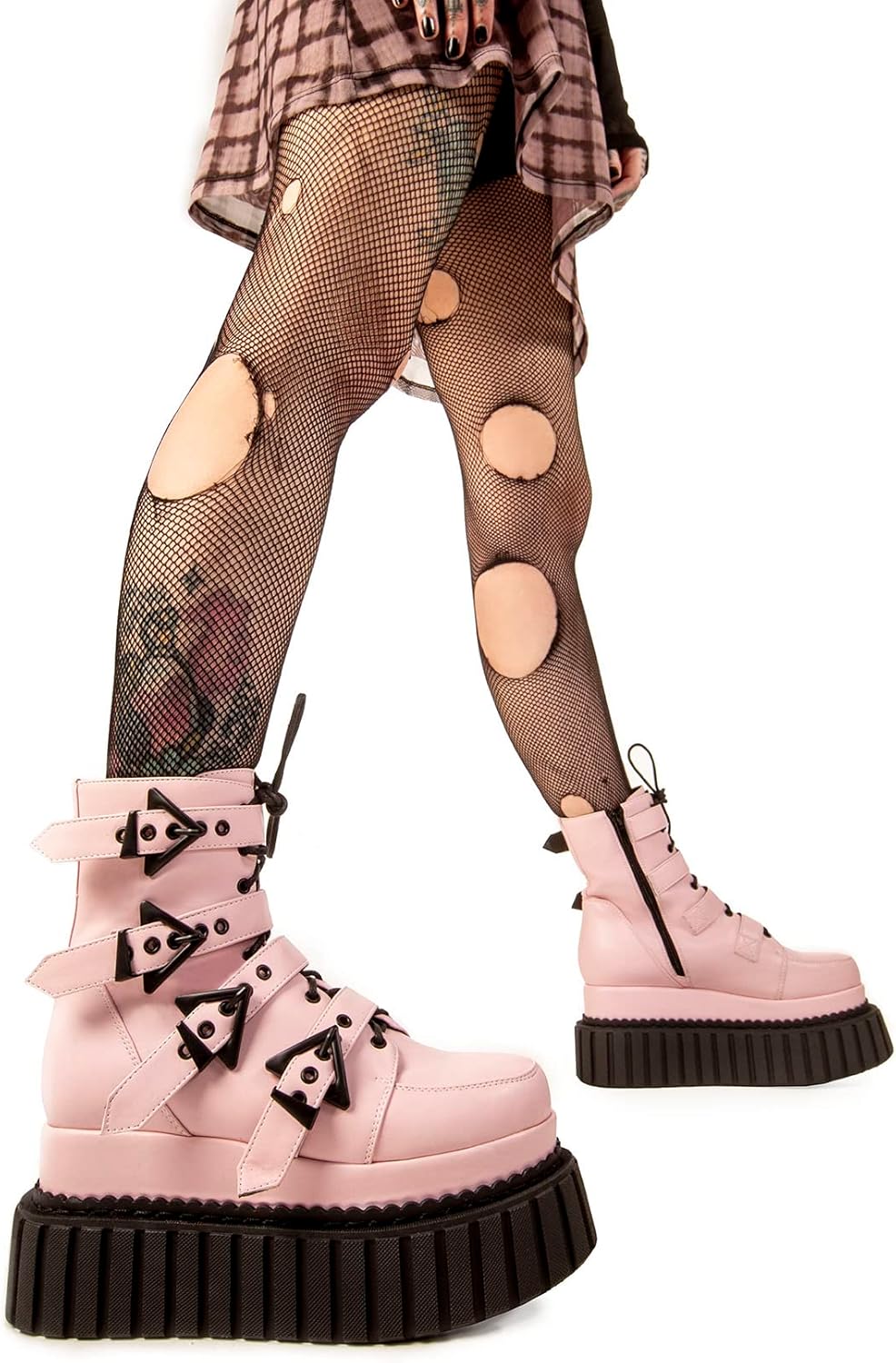 Нестабильные массивные ботинки на подошве типа «крипер» черного цвета. Особенности: четыре розовых регулируемых ремня с черными треугольными пряжками и черная регулируемая шнуровка с черными люверсами. Все это на нашей массивной подошве CHUNKY Creeper.
