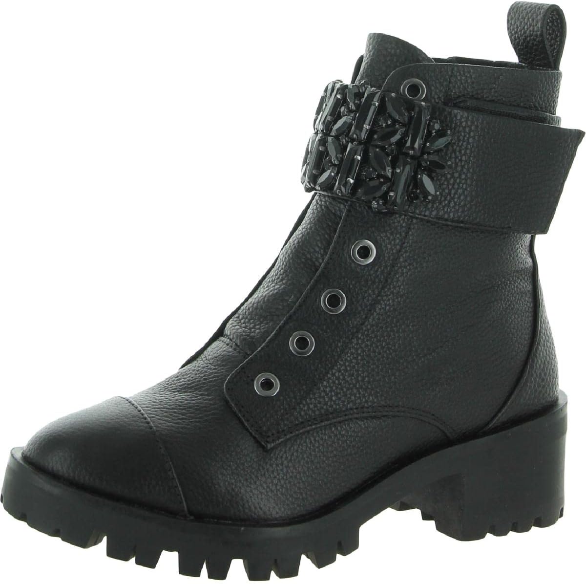 Ботинок для боевых действий с протекторной подошвой, полной внутренней молнией с бегунком KL, металлическими люверсами, ремешком на липучке с отделкой из каменных заколок, стелькой из пены с памятью формы