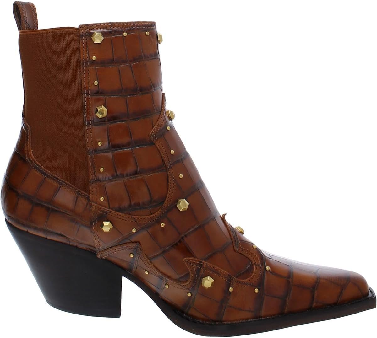 Эти ботильоны в западном стиле с эластичными вставками по бокам позволяют легко надевать их. Они доступны как в гладкой, так и в коже с тиснением под крокодила и украшены металлическими заклепками вдоль швов. Оригинальный каблук придает завершенный вид этим уникальным ботильонам.