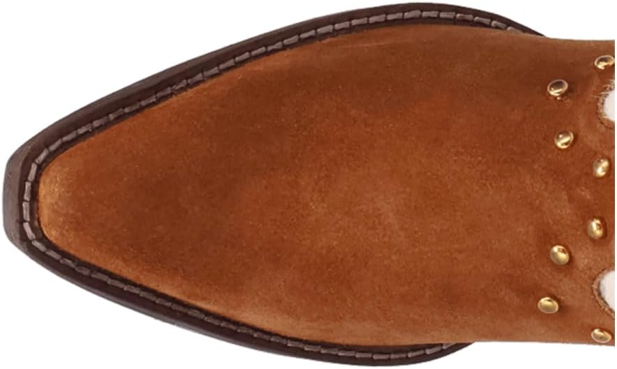 Представляем «Родео-Квин» - этот эффектный ботильоны выполнен из роскошного сочетания мягкой замши и кожи с мехом, создавая уникальную текстуру, которая одновременно смелая и элегантная. Украшенный блестящими заклепками, Родео-Квин добавляет изюминку в ваш вестерн-гардероб, делая его идеальным выбором для современной ковбойши, которая любит выделяться.