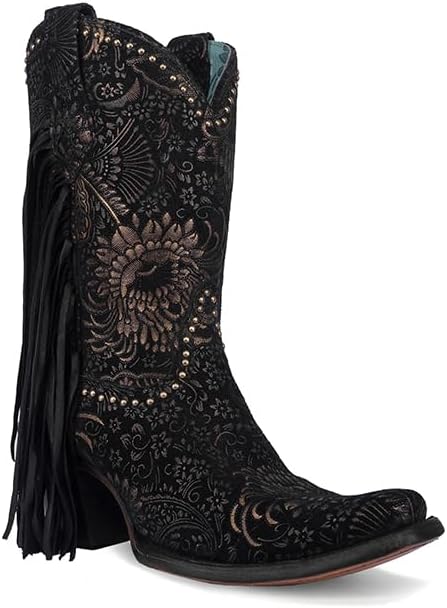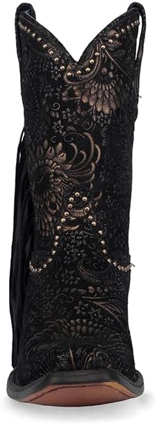 Женские замшевые ботильоны черного/золотого цвета с цветочным тиснением, заклепками и бахромой, узкий квадратный носок