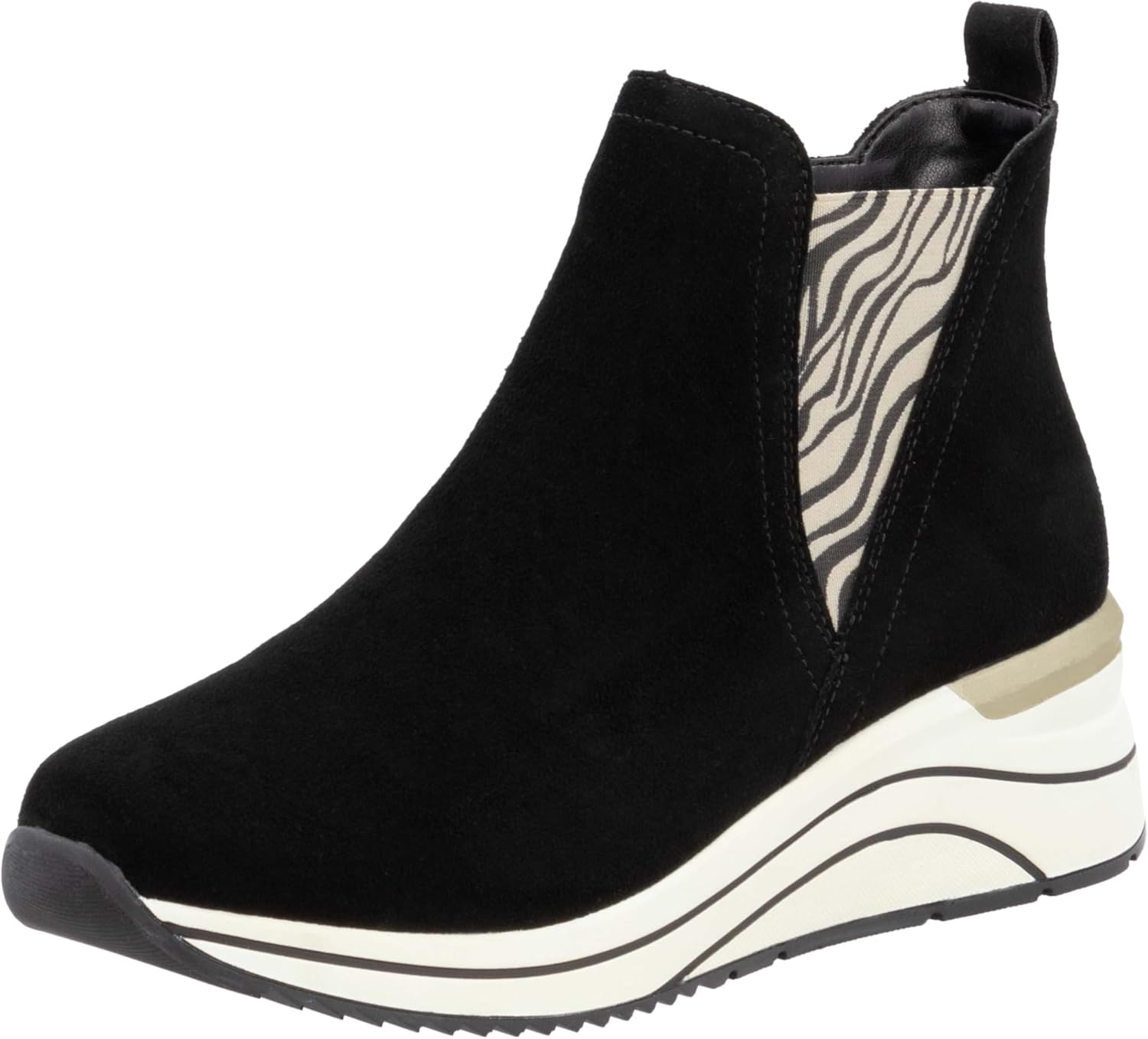 Максимальный стиль, максимальный комфорт. Эти черные замшевые ботинки Chelsea от Remonte обладают всем, что нужно для удобной обуви. Молния в сочетании с типичной эластичной вставкой на пятке позволяет легко надевать и снимать ботинки Chelsea. Модный анималистический принт придает обуви особый шарм. Технология Remonte Lite 'n Soft с ультрамягкой подошвой и съемной, мягкой стелькой обеспечивает комфортную посадку. Модель доступна в больших размерах и с расширенной полнотой, чтобы ноги не были стеснены. Джекпот.