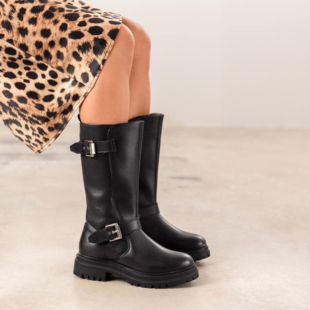 Тренд байкеров, который захватывает. Черные кожаные байкерские ботинки с пряжками и рифленой подошвой. Они оснащены высоко амортизирующей стелькой и гибкой подошвой. Стелька, подкладка и отделка изготовлены из выделанной кожи на кожевенных предприятиях, которые следуют более устойчивому процессу согласно стандартам Leather Working Group (LWG). Прядение тканей, используемых для изготовления подкладки, сертифицировано по стандарту Global Recycle Standard (GRS). Ты позволишь им ускользнуть?