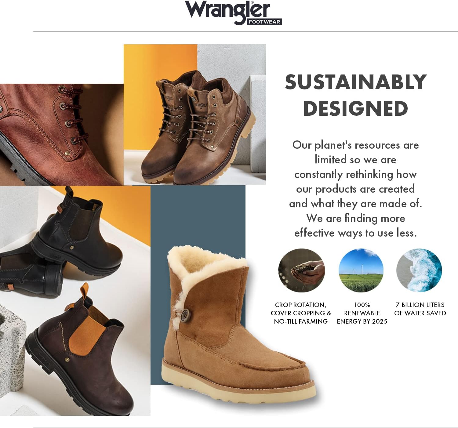 Wrangler обязуется производить обувь, которая никогда не ставит под угрозу стиль и комфорт. Женские ботильоны на танкетке Wrangler созданы с верхом из кожи полного зерна с 6-дюймовым складным голенищем, стельками Blend85 из переработанных материалов, амортизирующей подошвой на танкетке из резины и внутренней подкладкой из натуральной овчины. Они определенно обеспечивают тепло и комфорт на протяжении всего сезона. Кроме того, эти женские ботильоны на танкетке производятся с использованием устойчивых методов в рамках усилий Wrangler по положительному воздействию на нашу планету. Мы стремимся лидировать в разработке обуви с устойчивым дизайном, чтобы показать, как сильно мы заботимся о планете, которую все мы называем домом.
