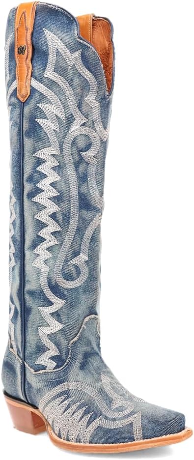 Сладкая и дерзкая в ботинках Denim Darlin' от Dan Post. С подошвой из кожи, популярным модным носком Snip, верх и голенище которых украшены замысловатой контрастной строчкой, эти 19-дюймовые ботинки предлагают вам удобную стельку Ultimate Flex и низкий вестерн-каблук для надежного комфорта.