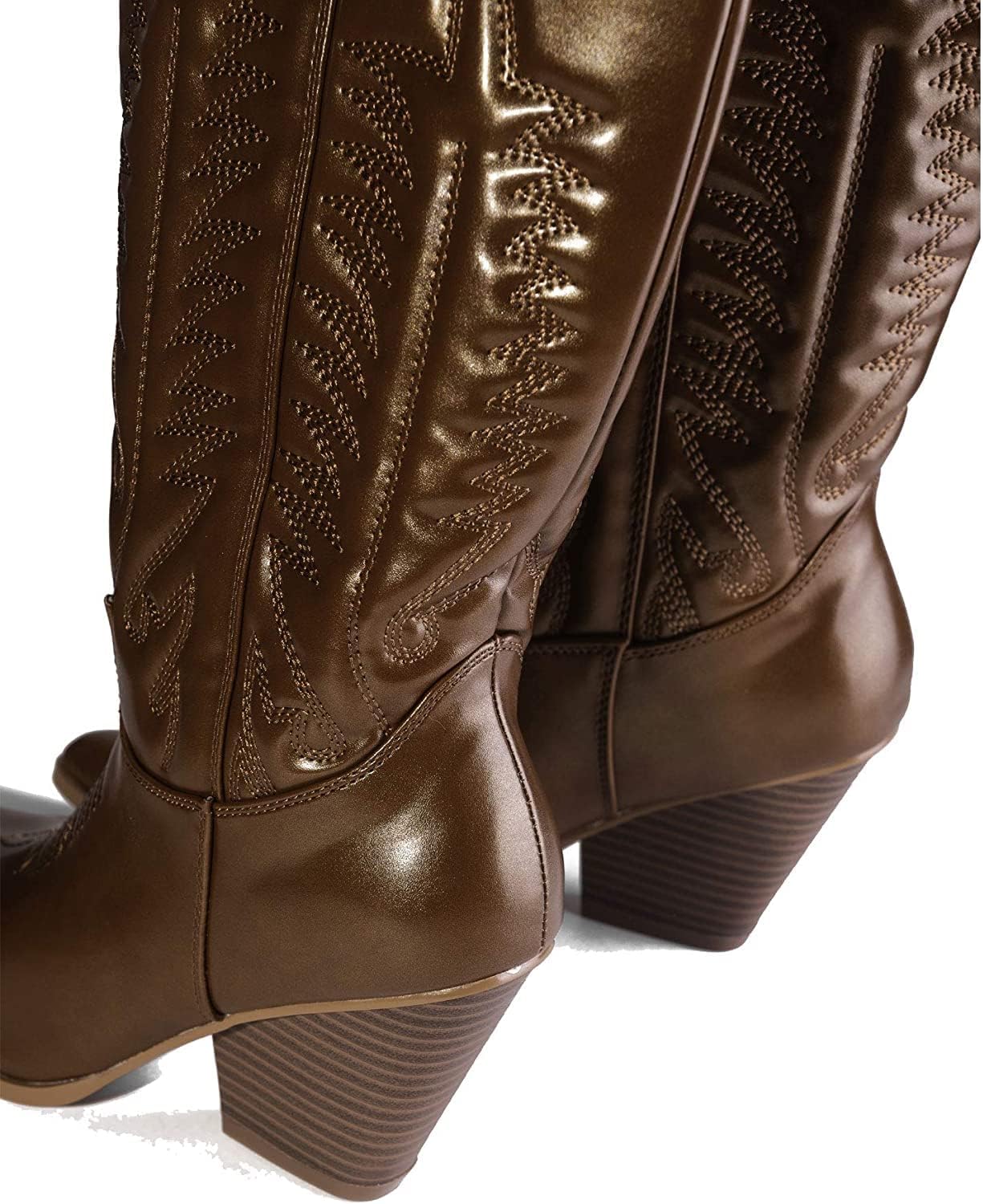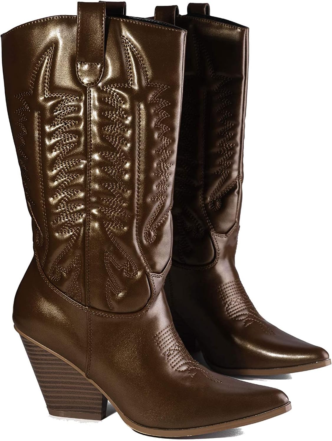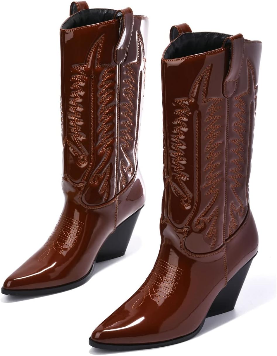 Высота каблука примерно 4 дюйма, заостренный закрытый носок, сапоги средней длины до середины голени без застежки, детальная строчка, ковбойские сапоги