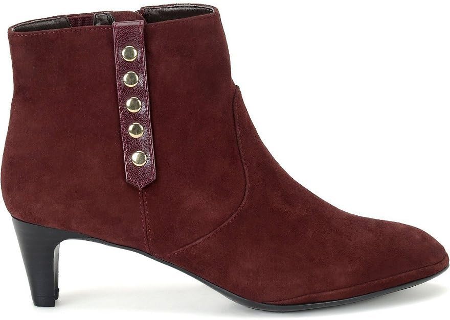 Круглый носок, заклепки, ремешок на голенище, боковая застежка на молнию, скрытые вставки на голенище, стелька из пенообразной памяти Pillowtop, подошва с хорошим сцеплением, каблук approx. 5 см, высота голенища approx. 10 см, окружность верха approx. 27 см. Материалы: верх из замши, текстильная подкладка, синтетическая подошва