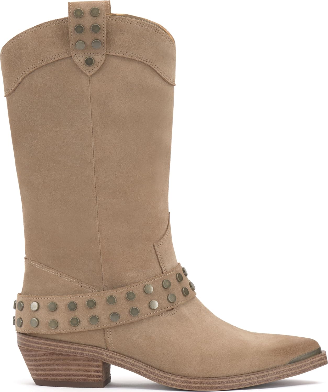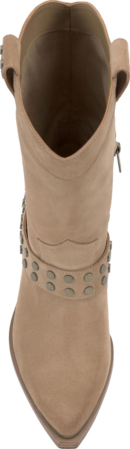 Этот сапог до середины икры, вдохновленный западным стилем, выполнен из богатой кожи и мягкой замши. С традиционными ремешками для надевания, украшенными круглыми металлическими элементами, и удлиненной подошвой с металлическим наконечником для защиты носка, сапог также имеет менее традиционный ремень с аппаратными элементами и внутреннюю молнию для удобного надевания. С изящной изогнутой верхней линией, сапог стоит на многослойном каблуке высотой 1,4 дюйма.