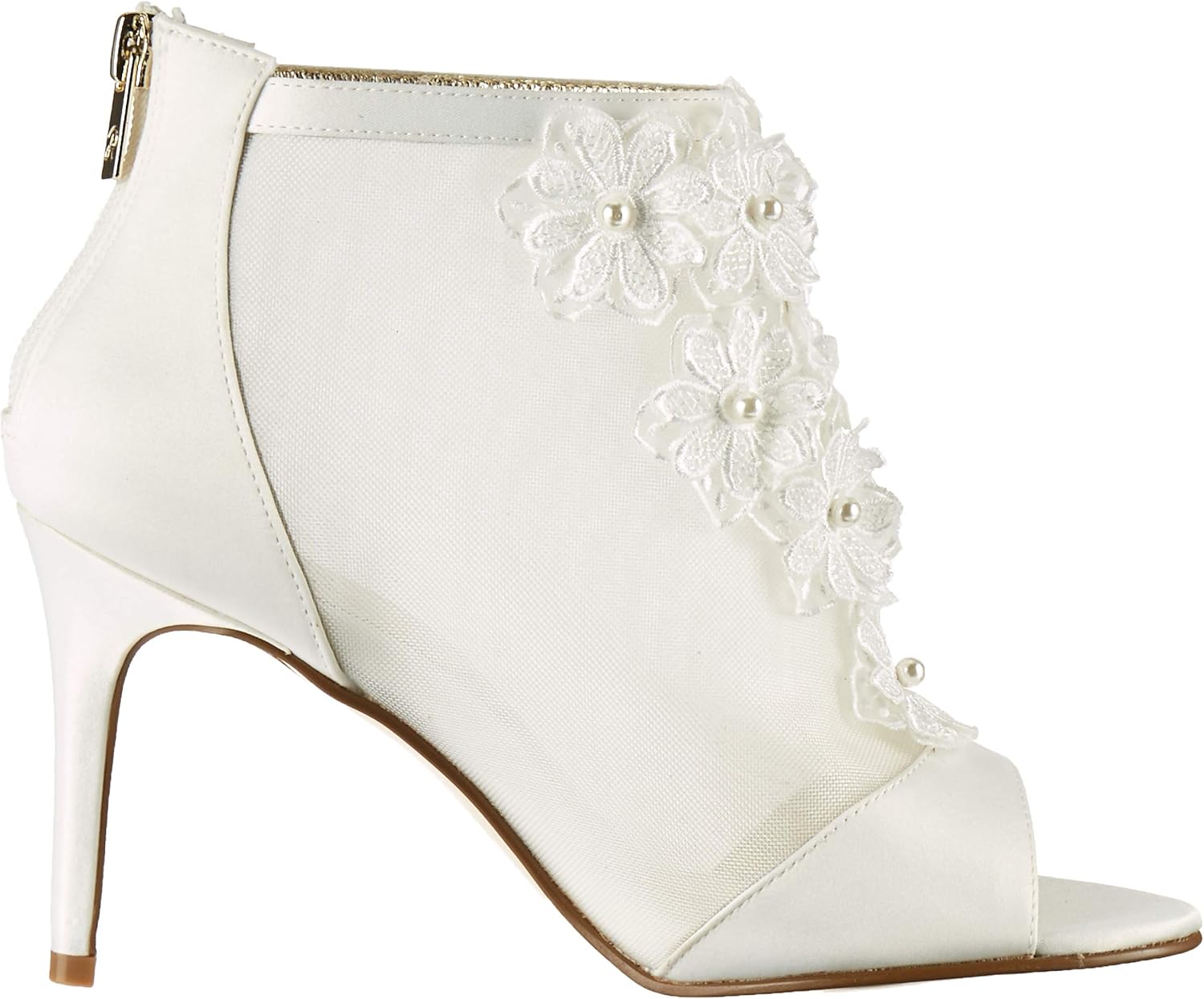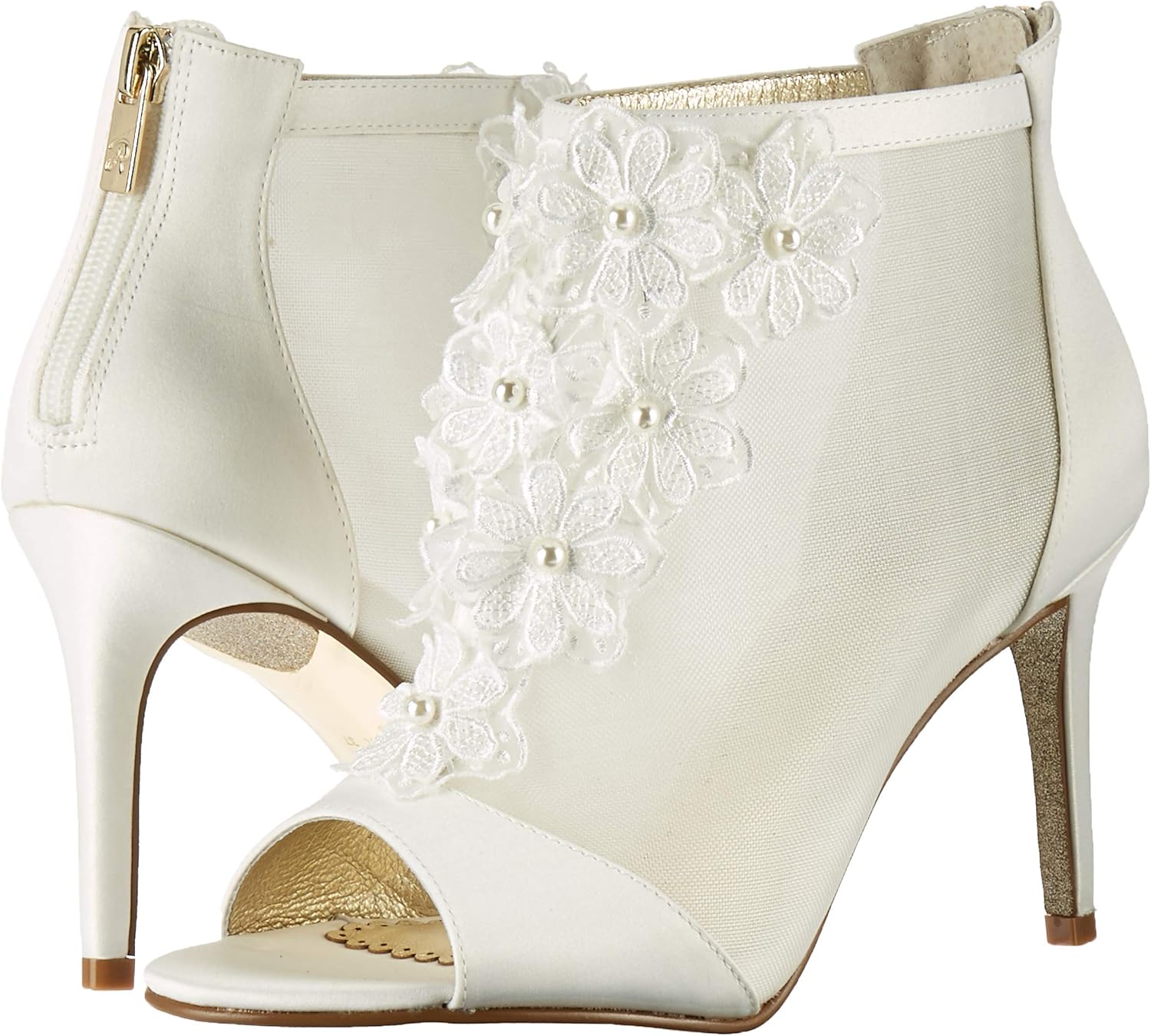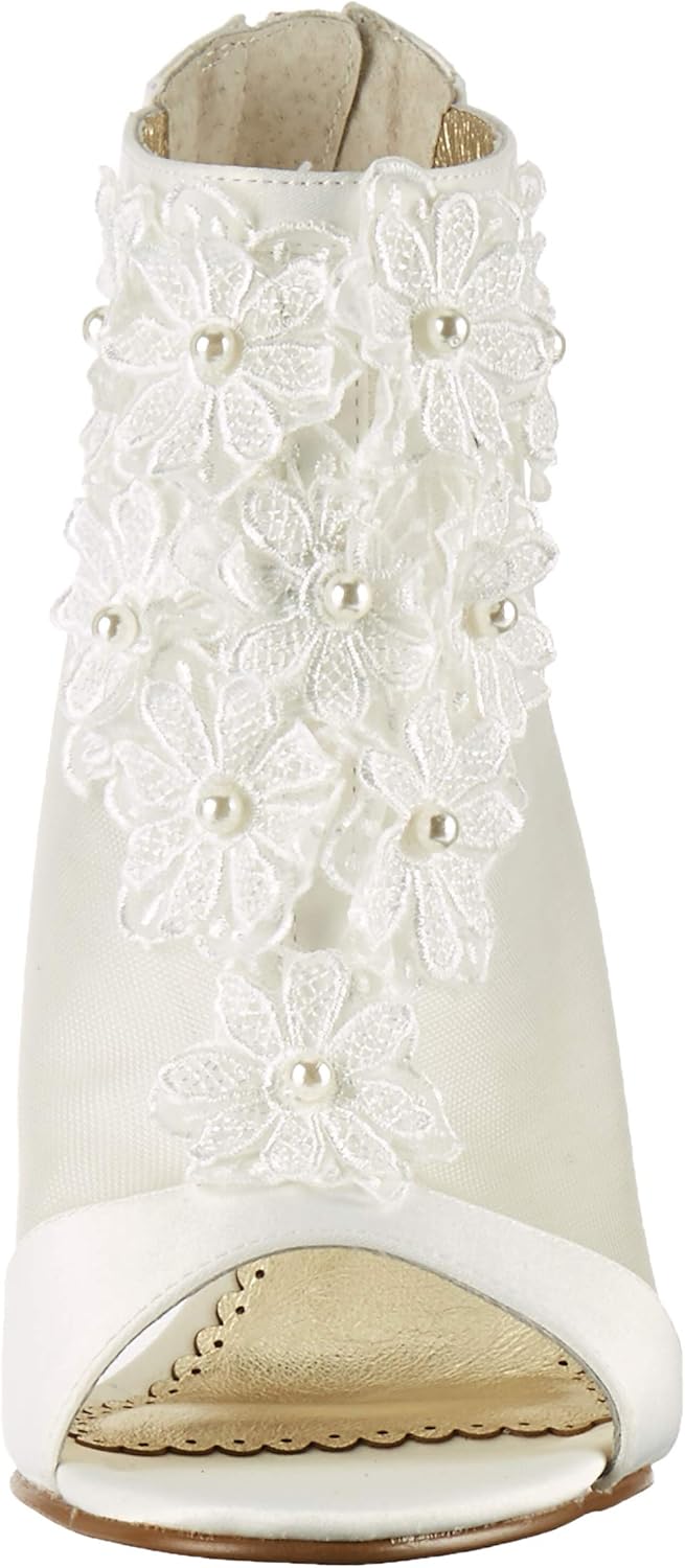 Свадебные ботильоны с открытым носком и цветочной аппликацией.