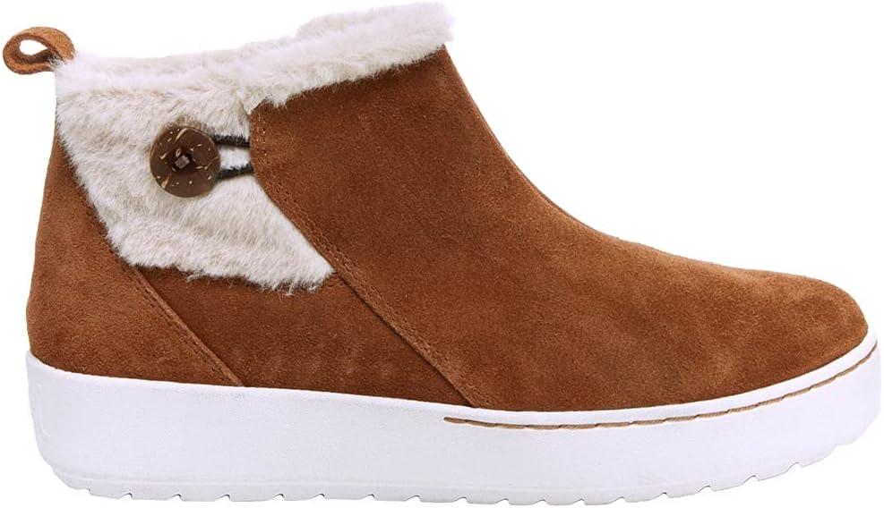 Поздоровайтесь с этой модной высокой обувью! Водоотталкивающий верх из замши с плавными линиями и вулканизированным эффектом Отделка из искусственного меха и декоративная пуговица на щиколотке Стелька из пены с эффектом памяти для комфорта стопы Высота каблука 1-5/8"