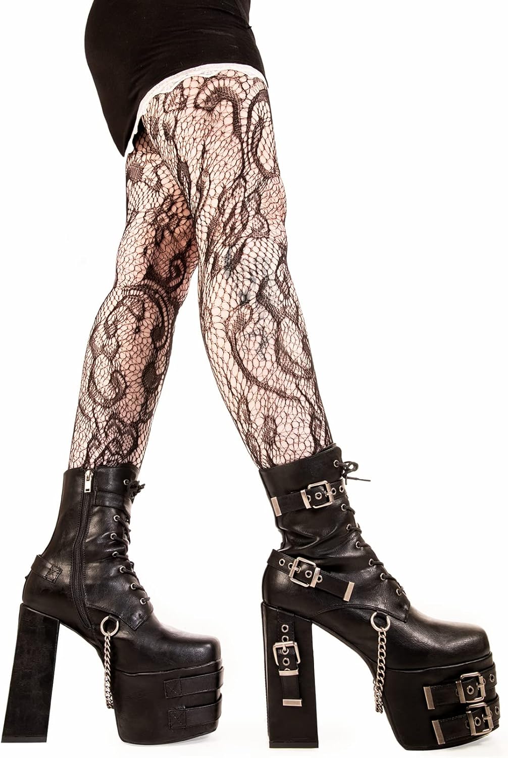 100% веганский Регулируемая шнуровка черного цвета с серебристыми люверсами. Также есть две регулируемые ремешки через щиколотку и заднюю часть ботинок, а также три дизайнерские ремешки через подошву и каблук. Все ремешки оснащены серебряными квадратными пряжками и серебряными люверсами. Кроме того, вдоль нижней части ботинка висит серебряная цепочка с кольцом 'O'. Толстая платформа подошвы