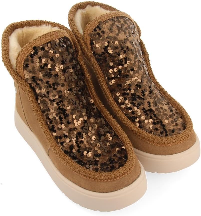 Будьте готовы к холодам, не теряя стиля. Австралийские ботинки тауп с пайетками и меховой подкладкой. Легкая стелька из ЭВА и подкладка из полиэстера. Очень теплые.