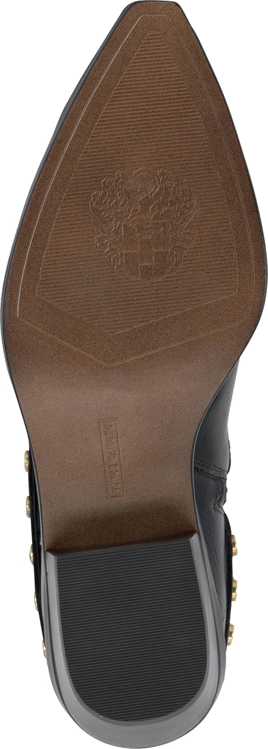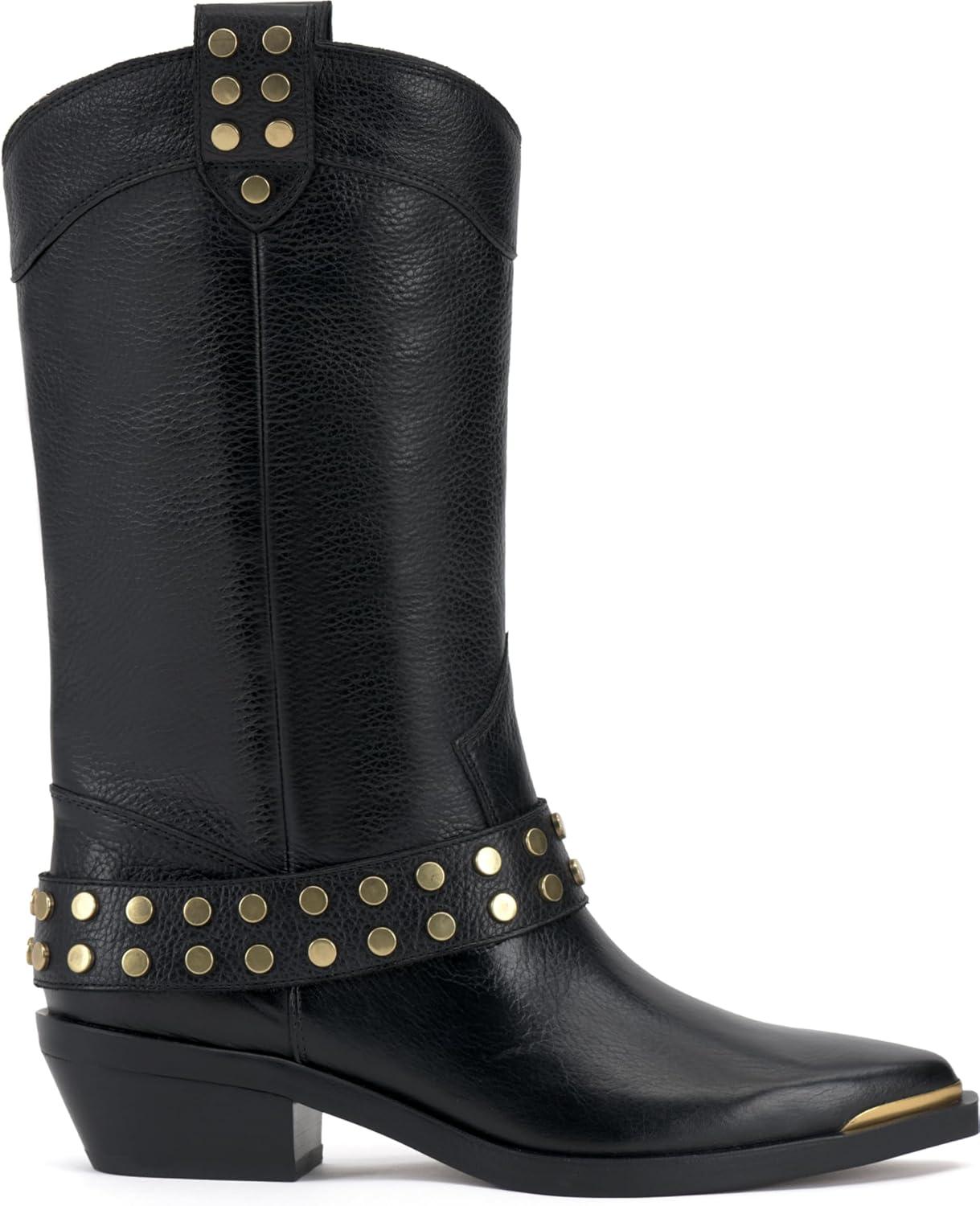 Этот сапог до середины икры, вдохновленный западным стилем, выполнен из богатой кожи и мягкой замши. С традиционными ремешками для надевания, украшенными круглыми металлическими элементами, и удлиненной подошвой с металлическим наконечником для защиты носка, сапог также имеет менее традиционный ремень с аппаратными элементами и внутреннюю молнию для удобного надевания. С изящной изогнутой верхней линией, сапог стоит на многослойном каблуке высотой 1,4 дюйма.