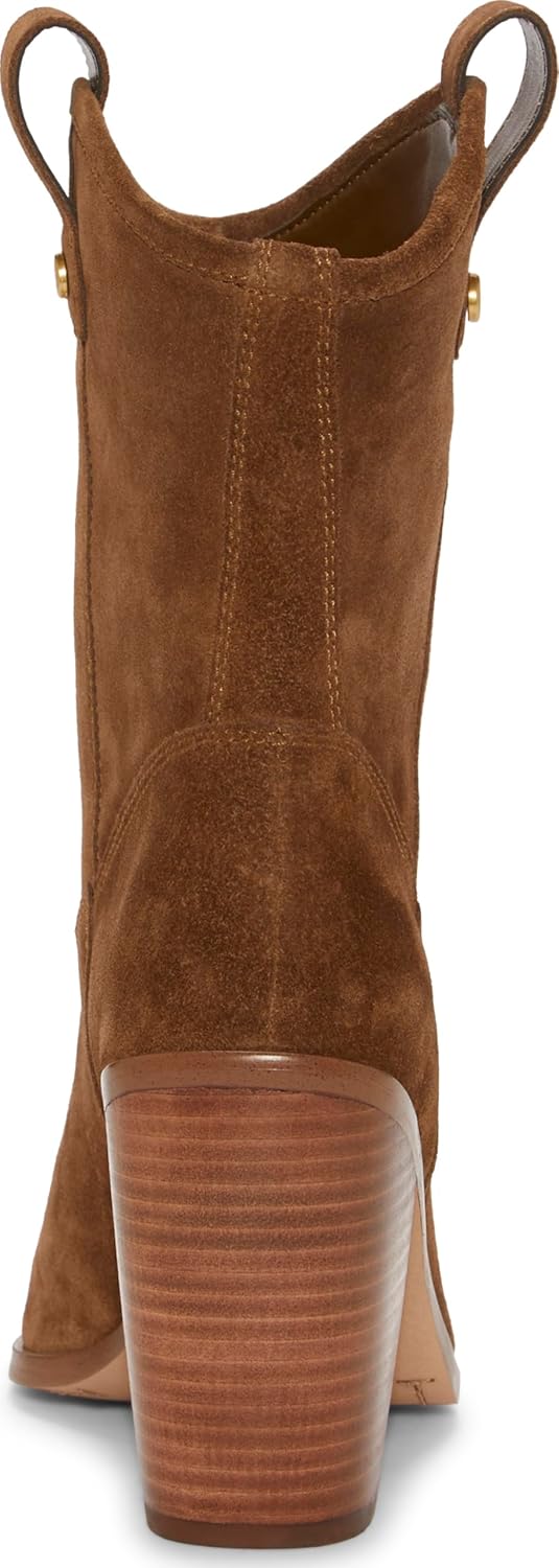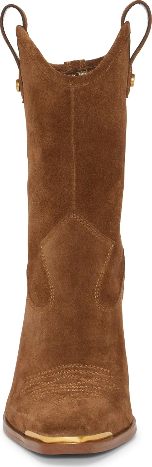 Эти ботильоны в западном стиле выполнены из мягкой замши и имеют устойчивый каблук-блок высотой 3,5 дюйма. Ботинок украшен декоративной строчкой на подъемной части, золотой окантовкой носка, а также петлями для надевания с золотыми заклепками с логотипом.