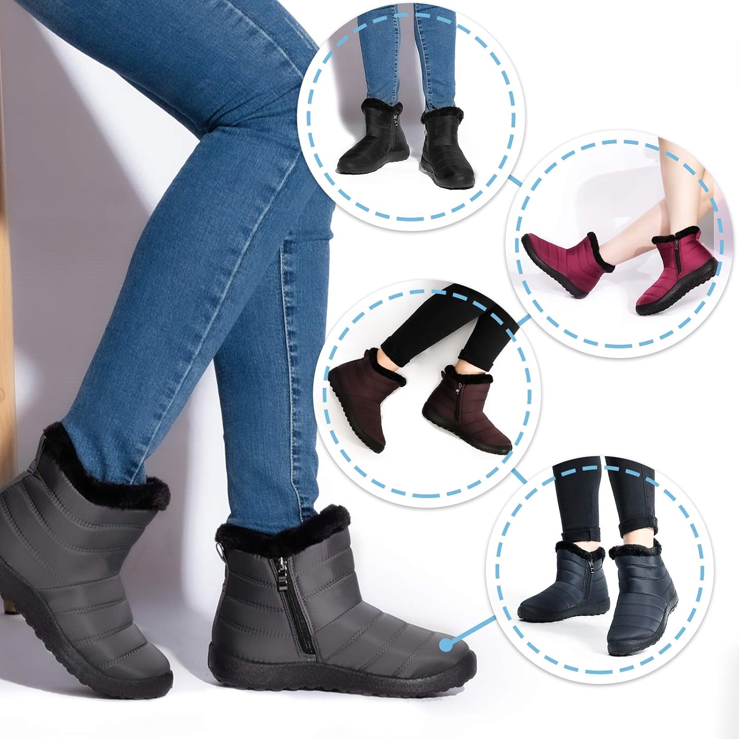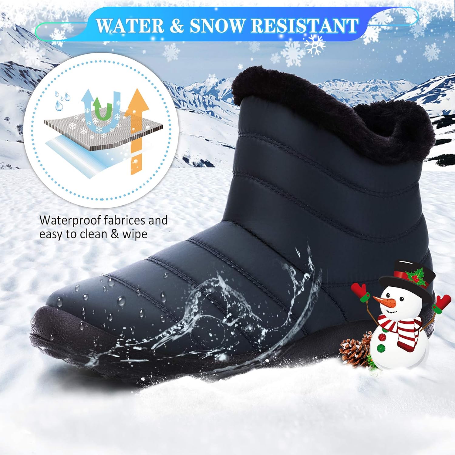 Водонепроницаемые советы: Водонепроницаемый верх ботинка для снега, подходит для прогулок в снежные и дождливые дни. Очень удобно чистить - достаточно протереть тряпкой. ВНИМАНИЕ - не водонепроницаемые при полном погружении в воду, так как есть небольшие отверстия в зазоре, и материал от верха до подошвы сделан с использованием клея, поэтому при погружении в воду обувь может промокнуть.