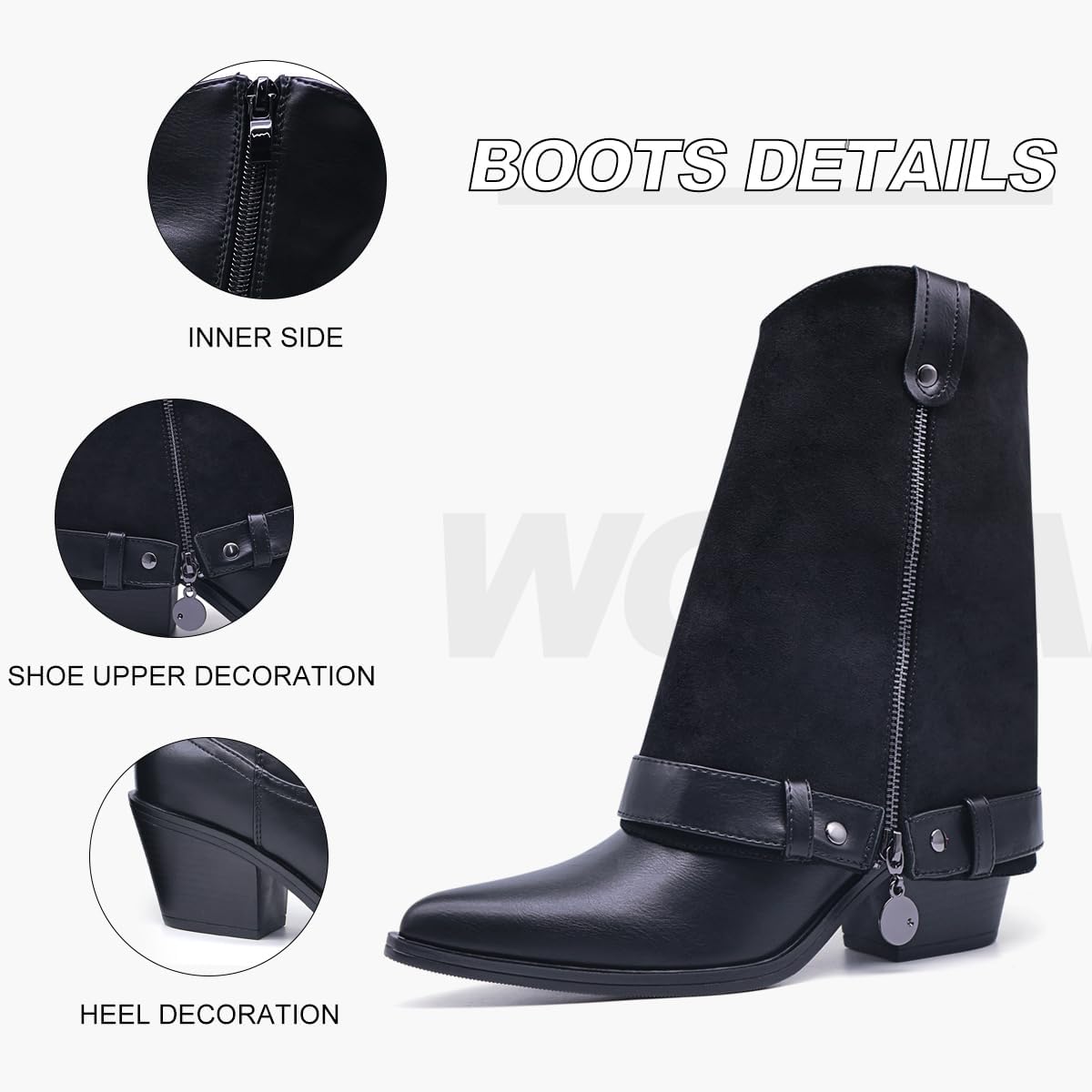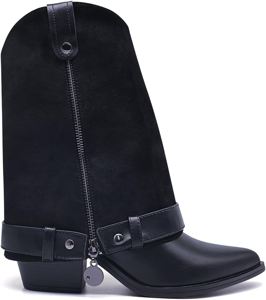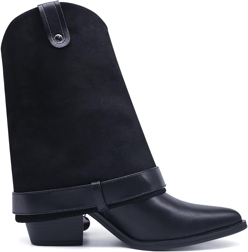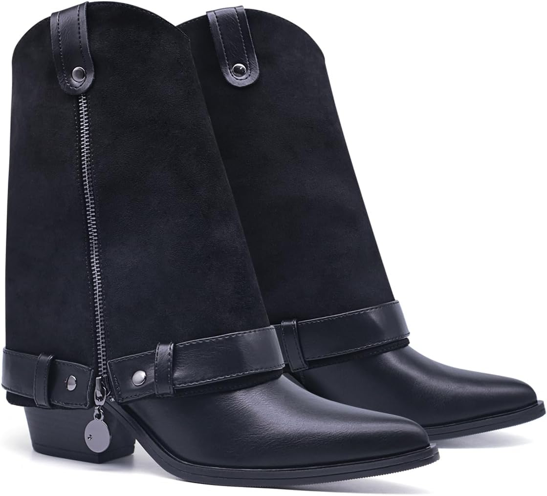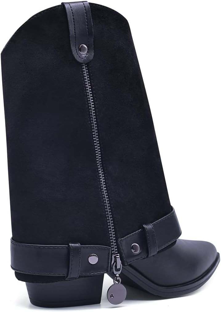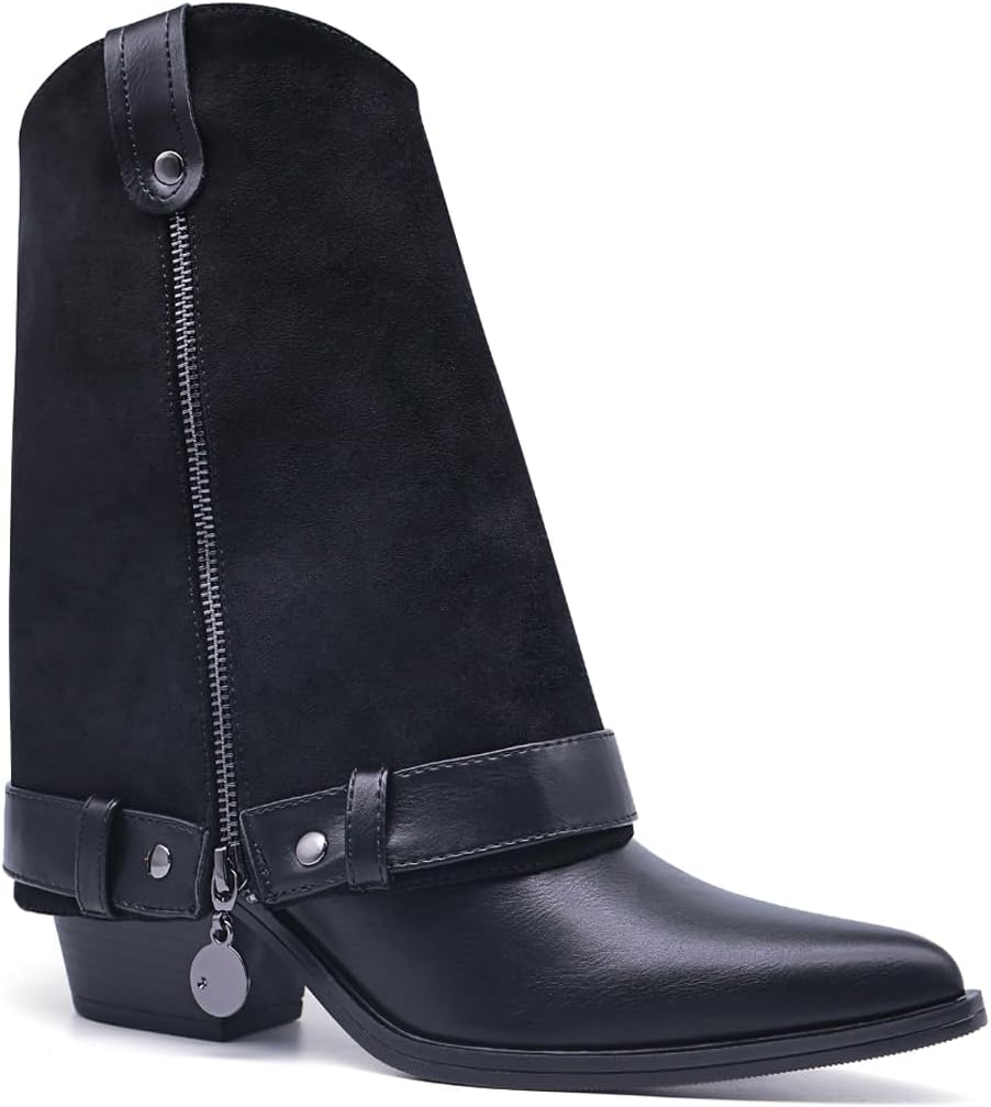 Generic Ботинки Convertible Faux Leather Boot,Adjustable Boot Cuffs Collar,2-in-1 Zip On Ankle Boot Accessories,Black Leather,Pointed Toe, Block Heel
