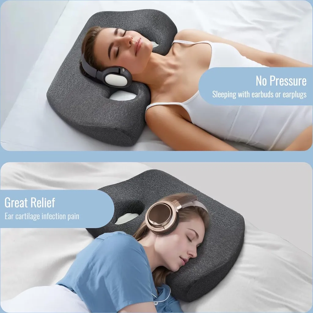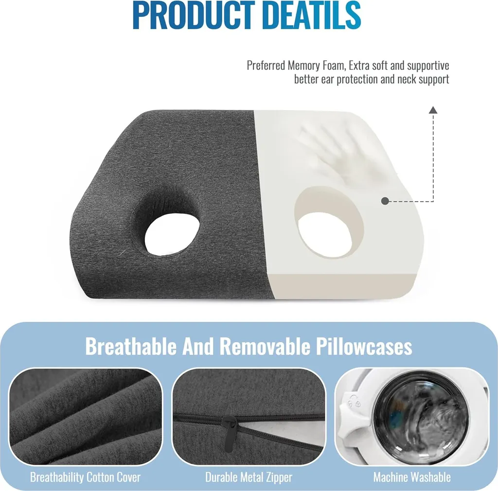 【Размеры】 Амбушюры имеют размеры приблизительно 38 x 54 x 11 см в длину, ширину и толщину. Внутренний диаметр ушного отверстия составляет приблизительно 11 x 16,5 см в длину и ширину. Два больших отверстия обеспечивают больший комфорт; наша подушка почти не оказывает давления на ваши уши, позволяя вашей шее и голове полностью расслабиться и устраняя напряжение и стресс, поэтому вы можете быстро заснуть. Она также достаточно большая, чтобы вместить наушники для дополнительного удобства и комфорта. 【Максимальный комфорт для ушей】 Подушка для прокалывания ушей имеет наполнитель из пены с эффектом памяти, который мягкий и поддерживающий, позволяя вам спать, как на облаке. Наволочка изготовлена из дышащей хлопковой ткани, которая мягкая, дышащая и охлаждающая. Все материалы приятны для кожи и безопасны, гарантируя, что вы проснетесь отдохнувшим. 【Облегчение боли в ушах】 Эта подушка для прокалывания ушей очень полезна для облегчения боли в ушах во время сна. Если у вас проколот ухо или травма уха, или если вы привыкли носить беруши или наушники во время сна, вдали от шума или храпа вашего партнера, эта подушка для пирсинга ушей станет для вас особым сюрпризом, позволяя вам спокойно спать или погрузиться в музыку без боли в ушах. 【Универсальный дизайн】 Боковая спальная зона подушки для пирсинга имеет конструкцию с двойным отверстием для ушей для тех, кто спит на боку, носит пирсинг ушей и наушники, что помогает снять боль в ушах. Спальная зона на спине поддерживает вашу шею для спокойного ночного сна. Изогнутый контурный дизайн обеспечивает эргономичную посадку вокруг шеи и плеч, а небольшое отверстие в центре подушки идеально подходит для ваших ушей, обеспечивая вам комфортный сон. 【Широкое применение】 Эта подушка для пирсинга ушей - это больше, чем просто подушка; это комплексное решение. Большое ушное отверстие позволяет с удобством носить серьги, слуховые аппараты, шумоподавляющие беруши и наушники, что делает его идеальным выбором для людей с различными потребностями, связанными с ушами.