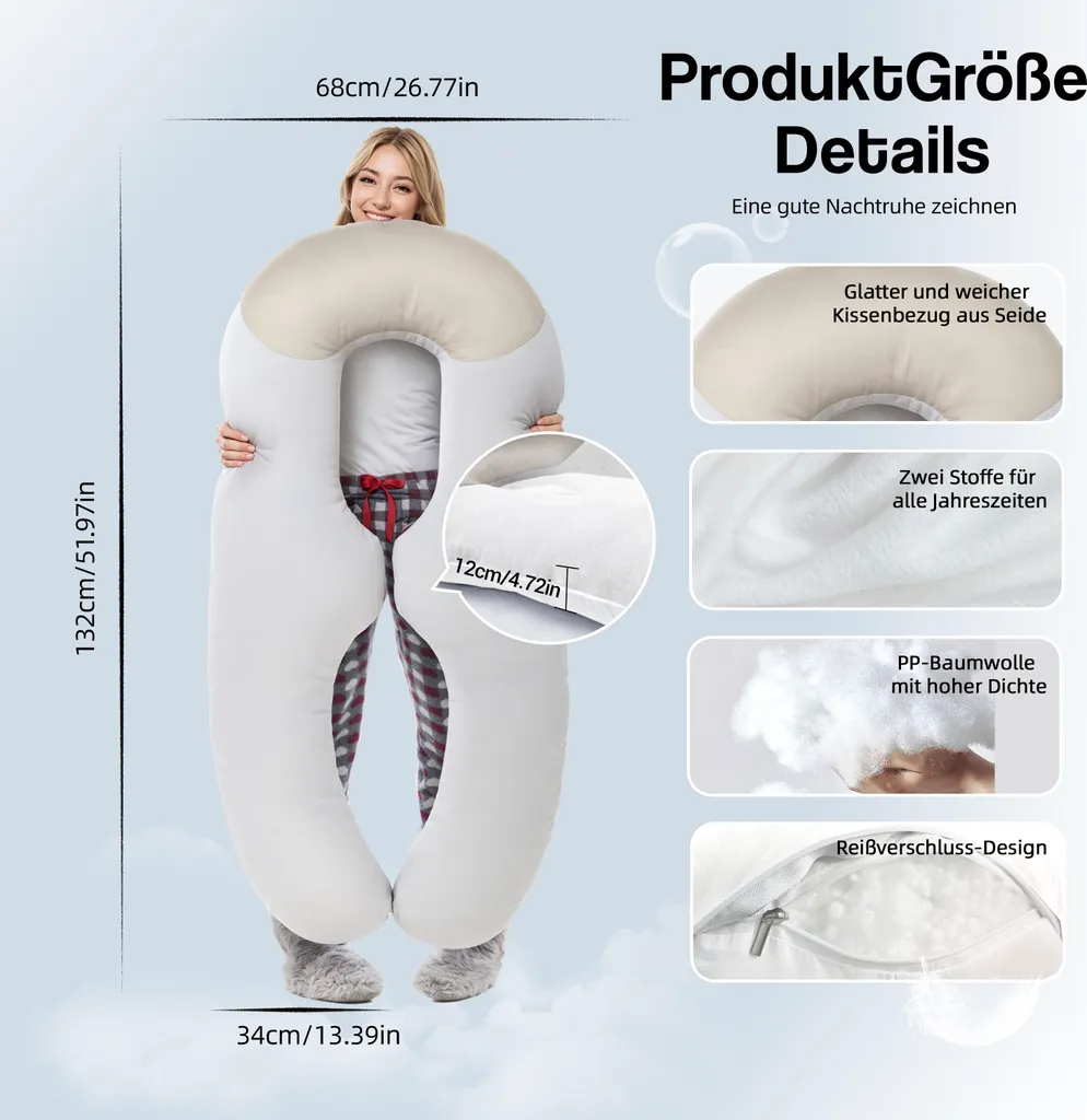 Инновационный дизайн: наша подушка для сна на боку для взрослых имеет уникальную двухслойную конструкцию: теплый короткий плюш спереди и прохладный ледяной шелк сзади. Этот дизайн обеспечивает комфорт круглый год, окутывая вас нежными объятиями. Индивидуальная поддержка: подушка для тела U-образной формы с точкой излома на талии обеспечивает отличную поддержку, независимо от того, спите ли вы на боку или горизонтально, обеспечивая защиту талии, живота и спины. Разработанная специально для спящих на боку, подушка повторяет естественный изгиб ваших ног для оптимальной поддержки. Абсолютный комфорт: насладитесь самым удобным положением сна с нашей подушкой для сна на боку. Она обеспечивает комплексную поддержку головы, спины, ног и живота, снижая давление на голову, шею, плечи, руки, позвоночник и колени, способствуя спокойному сну. Универсальное использование: эта подушка для сна на боку не только отличное средство для сна, но и универсальна в своих применениях. Вы можете удобно использовать ее на кровати, диване, кушетке или на полу, обеспечивая дополнительную поддержку во время таких занятий, как просмотр телевизора или отдых. Идеально подходит для кормления грудью, в качестве подушки для чтения офисным работникам или в качестве послеоперационной поддержки при необходимости. Простота ухода: эта U-образная подушка для тела, наполненная мягким и эластичным полиэстеровым волокном, обеспечит спокойный и комфортный сон. Как внутренний, так и внешний чехол подушки оснащены молниями для легкого снятия и чистки. Просто постирайте чехол для подушки для тела взрослого человека в обычной стиральной машине и сушилке для легкой стирки. Наслаждайтесь чистотой и комфортом надолго.