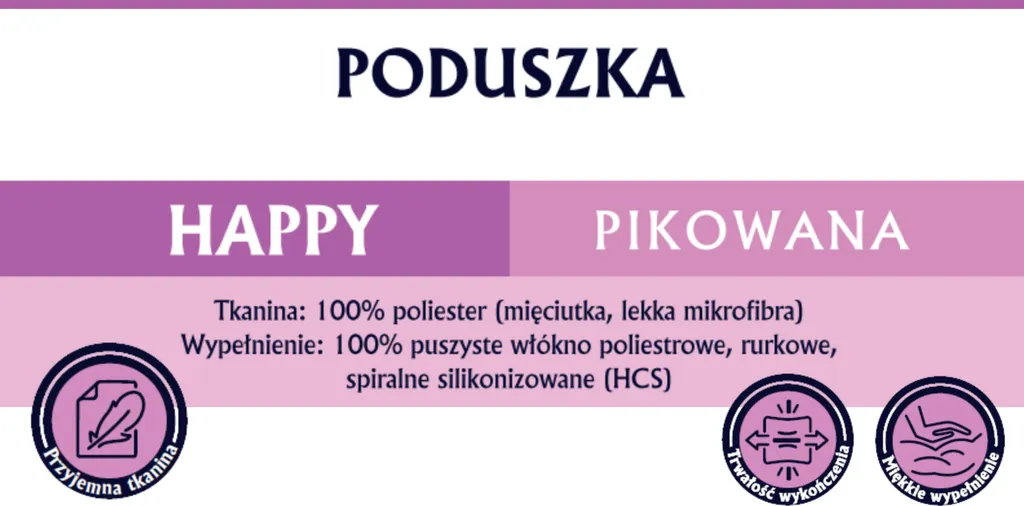 ПодушкаHAPPY QUILTEDсостоит из 3 стеганых слоев, что делает ее чрезвычайно прочной, рассчитанной на длительное использование и способной выдерживать интенсивную стирку и освежающие процедуры. Внутренний слой флиса предотвращает чрезмерное движение наполнителя.ТКАНЬ - ПРИЯТНАЯ НА ОЩУПЬ микрофибра