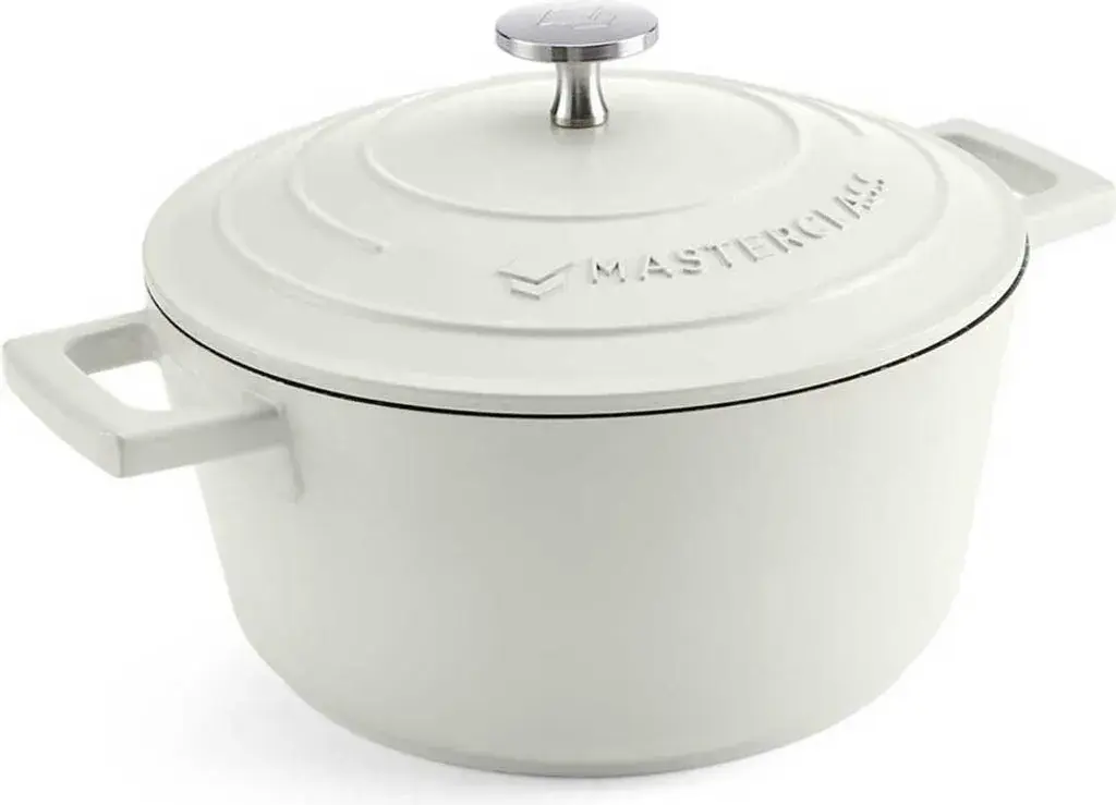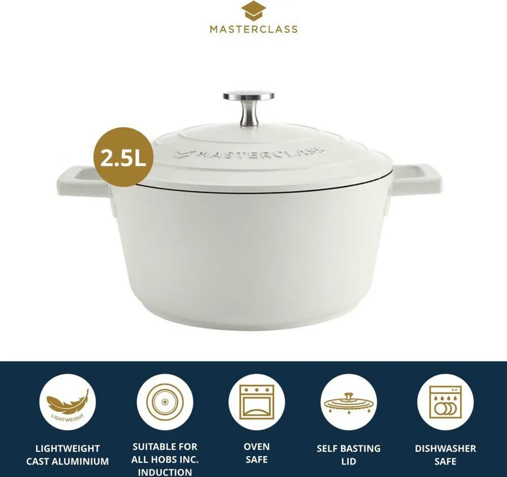Откройте для себя универсальность и выдающиеся характеристики литой алюминиевой кастрюли MasterClass объемом 2,5 л в сливках. Являясь частью популярной коллекции посуды из литого алюминия MasterClass, эта инновационная кастрюля отличается превосходной производительностью и легче чугуна, но при этом столь же прочна. Преимущества: Быстрое и равномерное распределение тепла: алюминиевый материал обеспечивает быстрое и равномерное приготовление пищи, сокращая время приготовления. Подходит для всех типов плит: благодаря дну из нержавеющей стали кастрюлю можно использовать на всех типах плит, включая индукционные. Безопасна для использования в духовке и идеально подходит для медленного приготовления: благодаря термостойкости до 200 °C эта кастрюля идеально подходит для медленного приготовления блюд в духовке. Размер: объем 2,5 л может быть слишком мал для больших семей или если вы регулярно готовите большие блюда. Эта кастрюля была разработана с учетом простоты использования. Она оснащена ручкой и двумя ручками для удобного переноса с плиты в духовку, а также крышкой для удержания пара, что позволяет получать сочные и ароматные блюда. Форма для запекания покрыта чрезвычайно прочным двойным покрытием, устойчивым к царапинам, которое действует как антипригарное покрытие. Это означает, что для приготовления требуется меньше масла, что делает блюда более полезными. Форма для запекания также легко моется и подходит для мытья в посудомоечной машине. Благодаря объему 2,5 л эта форма для запекания идеально подходит для приготовления больших блюд. Литая алюминиевая форма для запекания MasterClass доступна в различных цветах, включая черный, лавандовый, темно-зеленый, мятно-зеленый, синий металлик и серый омбре. Теперь в наличии также кремовый, красный и светло-голубой. MasterClass: Вы всегда хотели стать мастером на кухне, но не хватало подходящих инструментов?