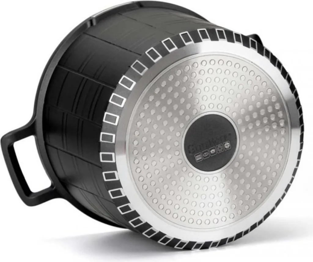 Гранитное покрытие - это антипригарное покрытие, обогащенное мелкой гранитной пылью, что придает ему большую твердость. Он тверже тефлона, но сохраняет его преимущества: не горит и хорошо распределяет тепло. Сочетает в себе преимущества чугунной и тефлоновой посуды. Обладает всеми преимуществами тефлона, но более устойчив к повреждениям и даже превосходит керамическое покрытие. Гранитное покрытие делает посуду исключительно устойчивой к царапинам и долговечной. В таких кастрюлях и сковородах можно жарить с минимальным количеством жира, поскольку посуда нагревается подобно камню и излучает тепло по всей поверхности. Сочетание алюминиевого корпуса и ферромагнитного основания позволяет использовать их на индукционных и всех других типах плит, а также использовать превосходные тепловые свойства литого и кованого алюминия на всех типах плит и варочных панелей.