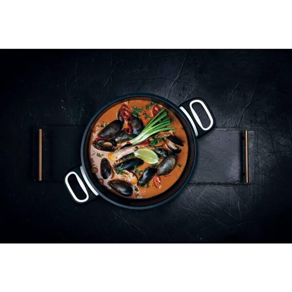 Макс. диаметр в см: 28. Антипригарный материал: ПТФЭ. Рагу, гуляш и паста получаются идеально. Приготовление на пару и тушение с сохранением витаминов. Литой алюминий - литые резьбовые вставки для надежной фиксации ручек и захватов - сверхтолстое дно (8-10 мм) для оптимальной теплопроводности и удержания тепла - идеально ровная и микрообработка для лучшего контакта с варочной панелью - высококачественное покрытие поверхности Lotan позволяет жарить и готовить без жира - дополнительно укрепленный ободок. Качество благодаря ручному литью. Отличные результаты приготовления, быстрое и простое приготовление - вот что такое посуда от AMT Gastroguss. Оптимальные свойства жарки и результаты приготовления подтверждают качество этих сковородок и кастрюль. Эта алюминиевая посуда отливается, запечатывается, собирается, тестируется и упаковывается вручную на нашем собственном заводе в течение многих лет. Посуда AMT Gastroguss - ваш удобный и незаменимый помощник изо дня в день. Изысканная и легкая, с этой посудой вам больше не нужно беспокоиться о слишком жирной пище. Здоровое питание больше не проблема, а естественная часть вашей повседневной жизни. Lotan производит революцию в технологии покрытий для кулинарии. Наше фирменное покрытие Lotan упрощает очистку и поддерживает посуду в гигиенически чистом состоянии. Долговечность и устойчивость к внешним воздействиям - отличительные черты этой продукции. Дно толщиной до 10 мм исключительно хорошо поглощает тепло, выделяемое в духовке, и сохраняет его во много раз лучше, чем обычная посуда. Это превосходное сохранение тепла экономит энергию и защищает окружающую среду. Чугунную посуду AMT можно использовать на всех распространенных типах варочных панелей, таких как газовые и электрические, керамические и галогенные. Разработано профессионалами - проверено в повседневной эксплуатации. Профессионалы Национальной сборной Германии по кулинарии и ведущие повара Немецкой ассоциации шеф-поваров неизменно демонстрируют высочайшее качество на кухне, как на международных соревнованиях, так и в повседневной работе.