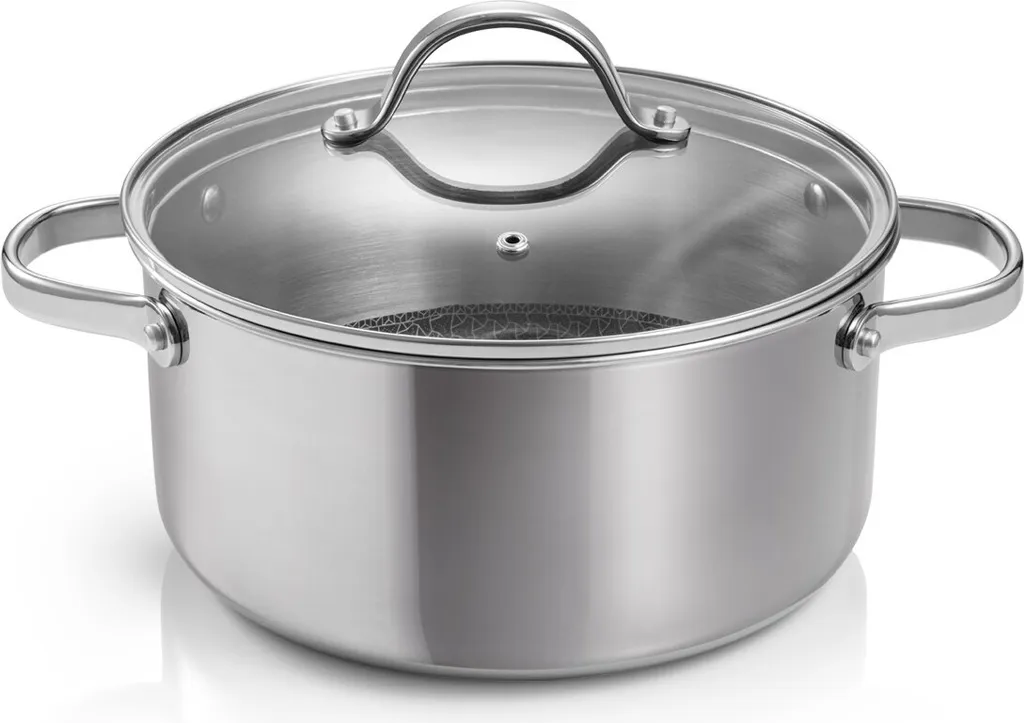 Посуда из нержавеющей стали с крышкой из цельного стекла и нержавеющей стали, а также отверстием для выхода пара. Инновационное антипригарное покрытие со стальной сеткой устойчиво к использованию с металлическими кухонными принадлежностями. Подходит для всех типов варочных панелей, включая индукционные, и может использоваться для запекания продуктов в духовке.